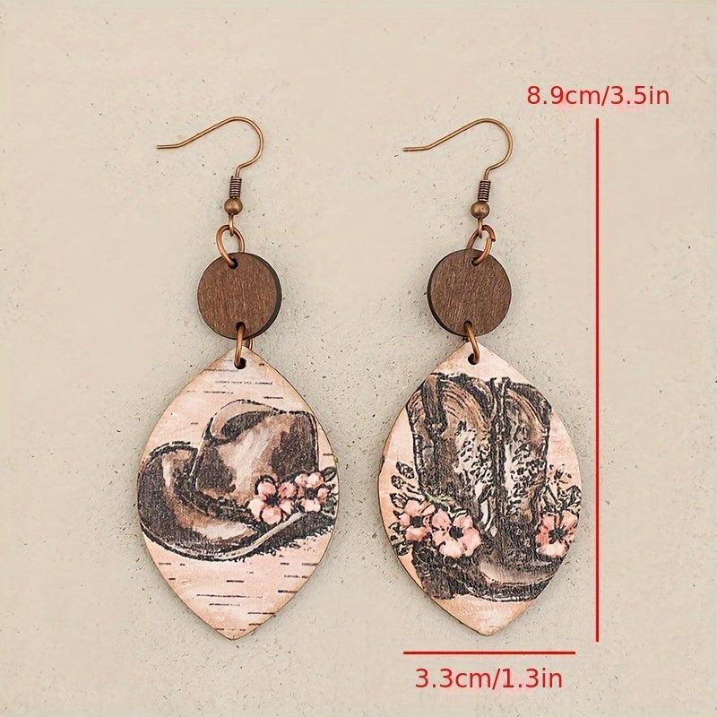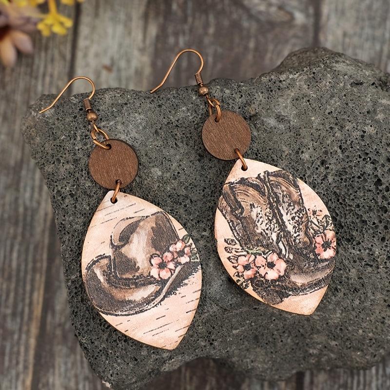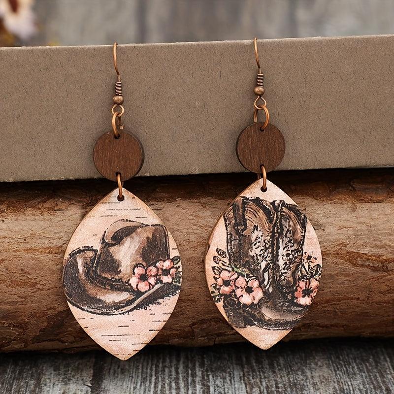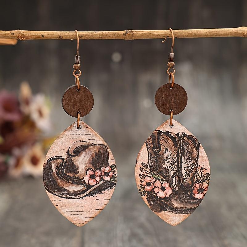 These wooden earrings feature a quirky asymmetric design with a vintage cowboy hat and boot print, perfect for casual attire.