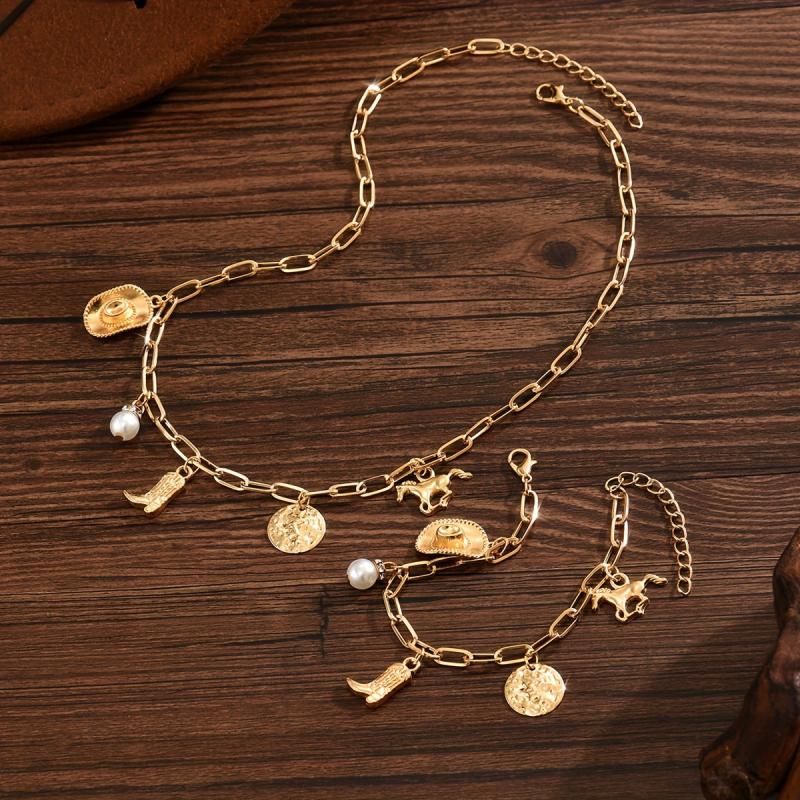 Complete your cowboy look with this vintage Western ethnic jewelry set featuring a necklace and bracelet. The set includes a cowboy hat boots pendant on an irregular chain.