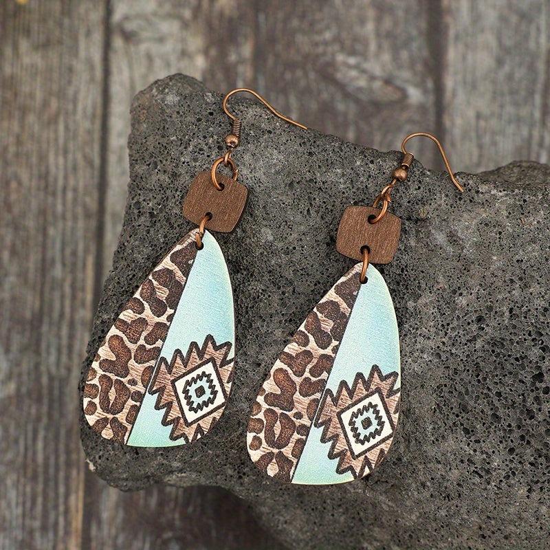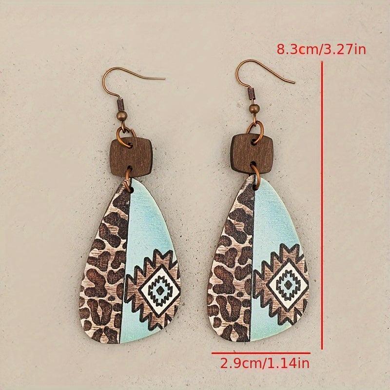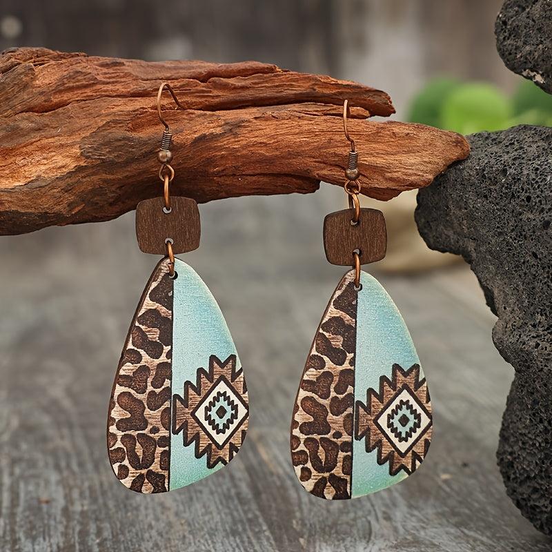 These lightweight wooden earrings feature a unique geometric cowhide print design, perfect for adding a touch of boho flair to your outfit year-round. Handcrafted from recycled wood and iron studs, these earrings are a stylish and sustainable accessory for women.