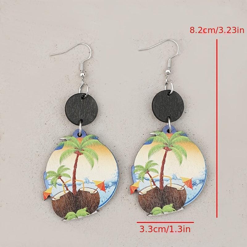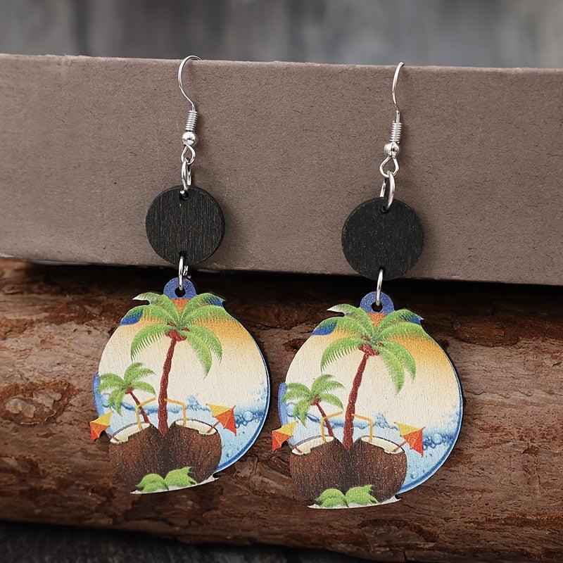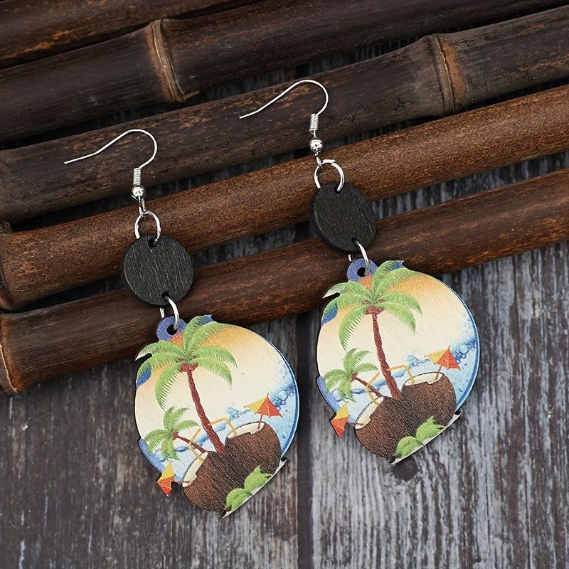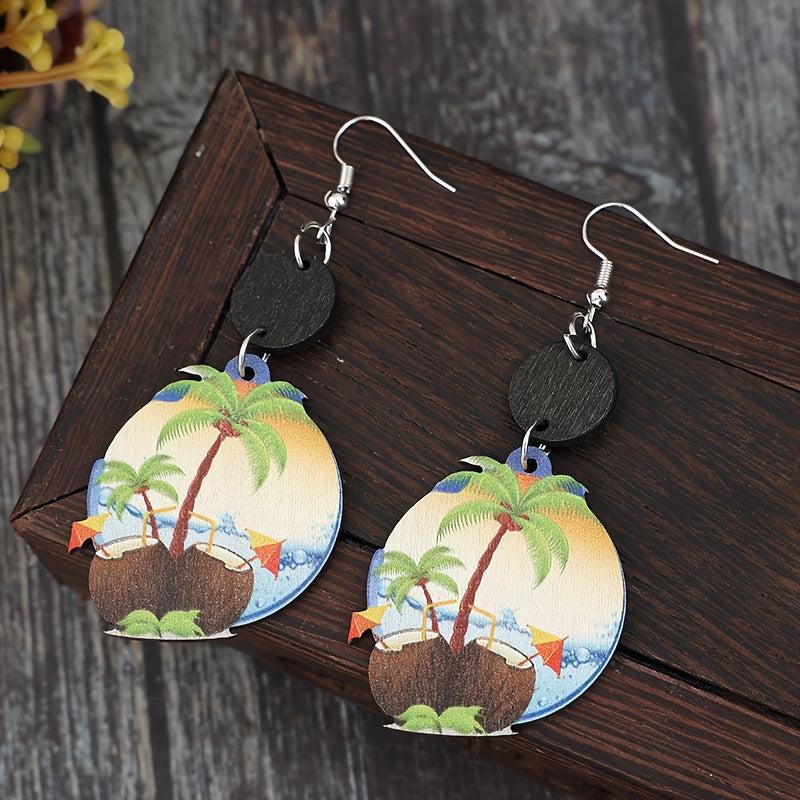 Upgrade your casual attire with these vintage vacation style wooden earrings featuring a tropical coconut tree and salt drop design. Perfect for getaways and beach outings.
