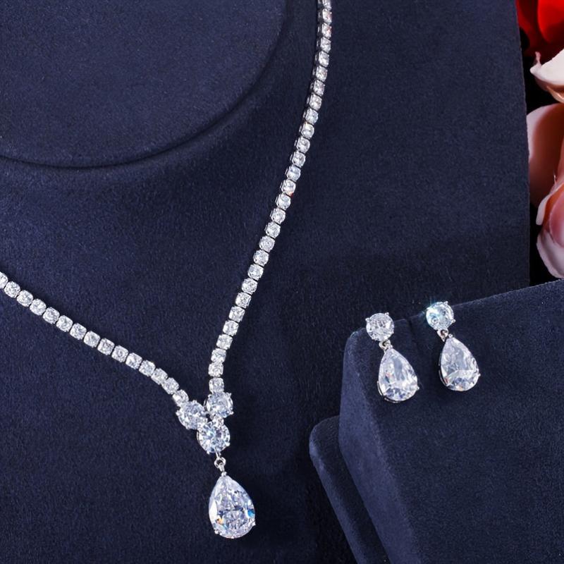 Enhance your look with this elegant silver plated copper jewelry set featuring water drop earrings and necklace adorned with synthetic zirconia. Perfect for weddings, banquets, and Ramadan celebrations.