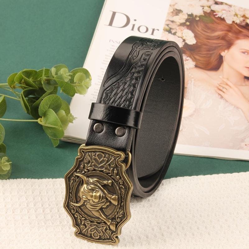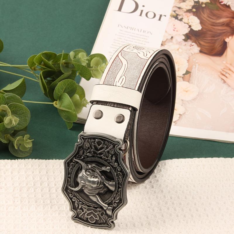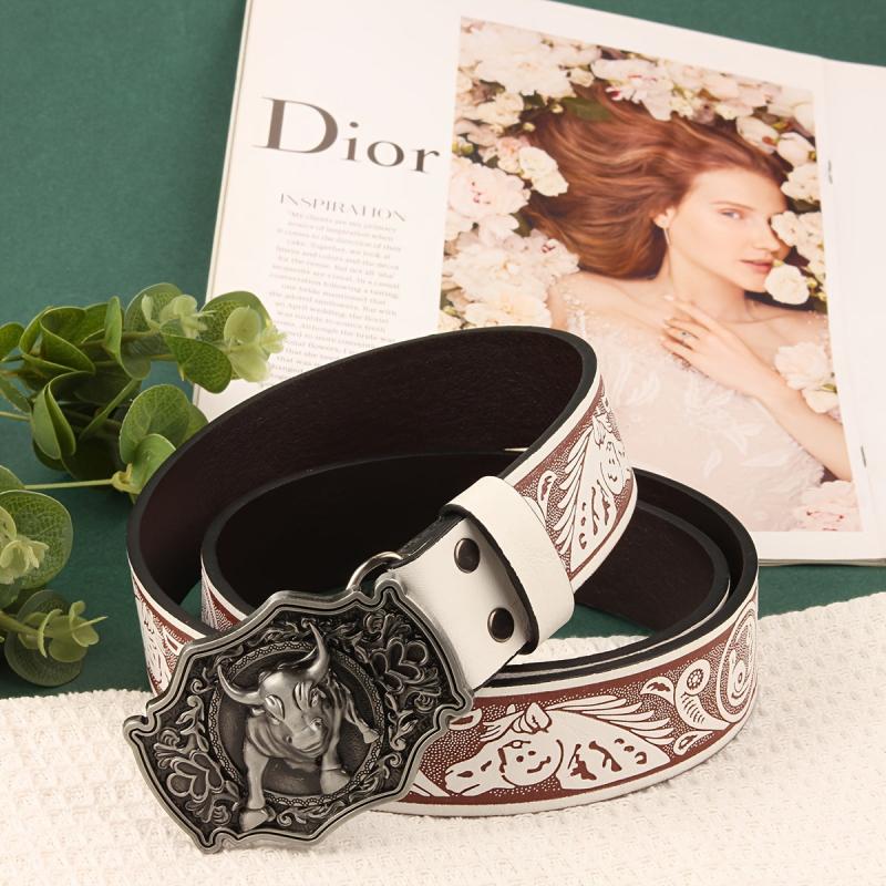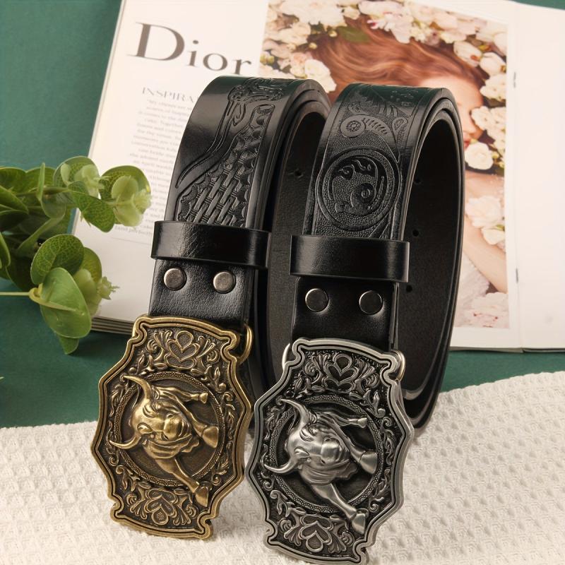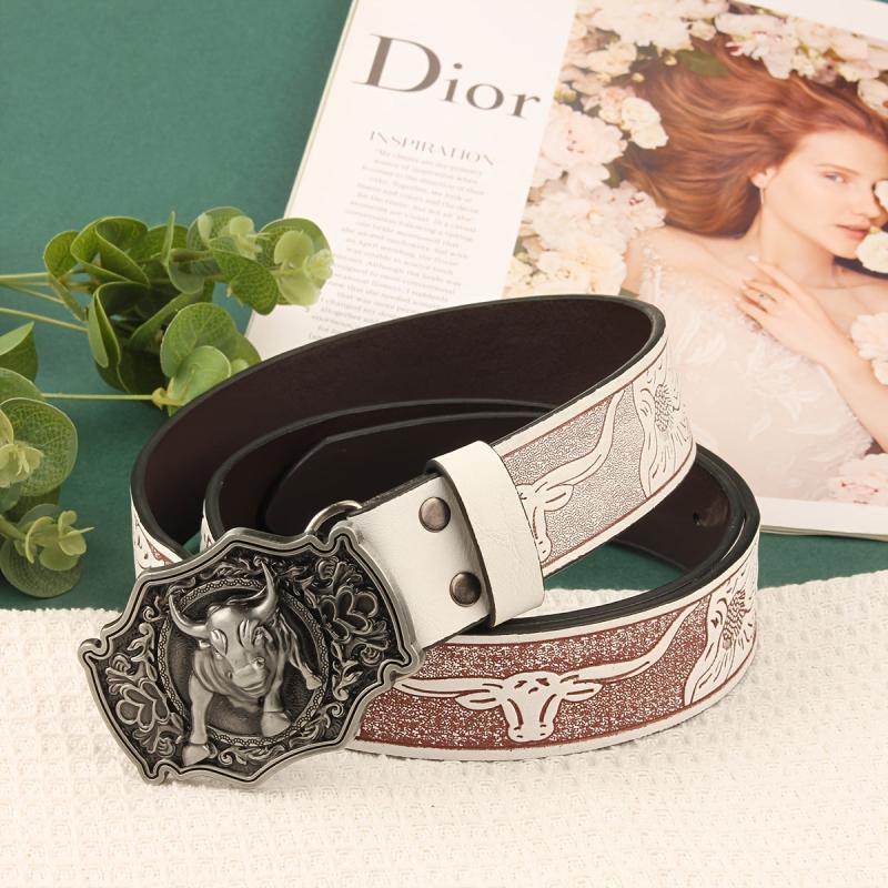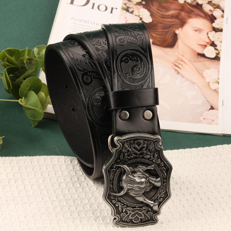 This belt features a golden and silvery bull pattern buckle that adds a stylish touch to your outfit. It is suitable for both men and women.