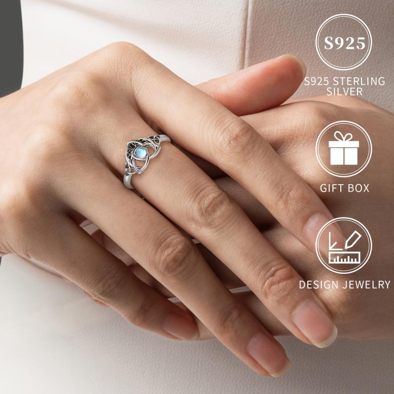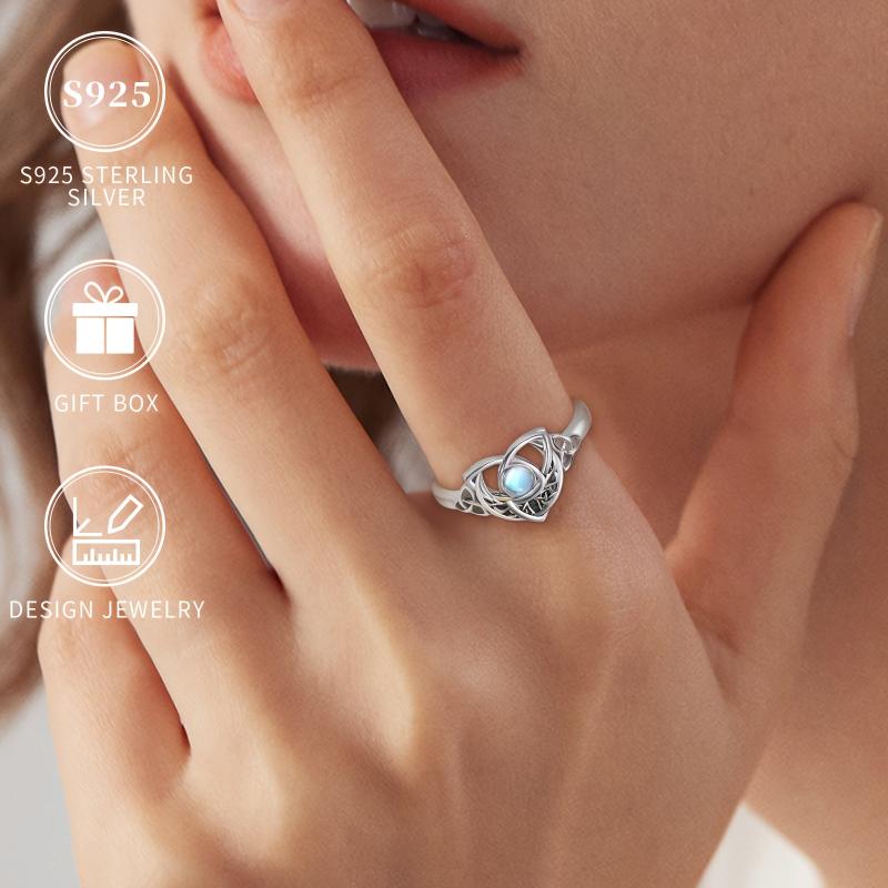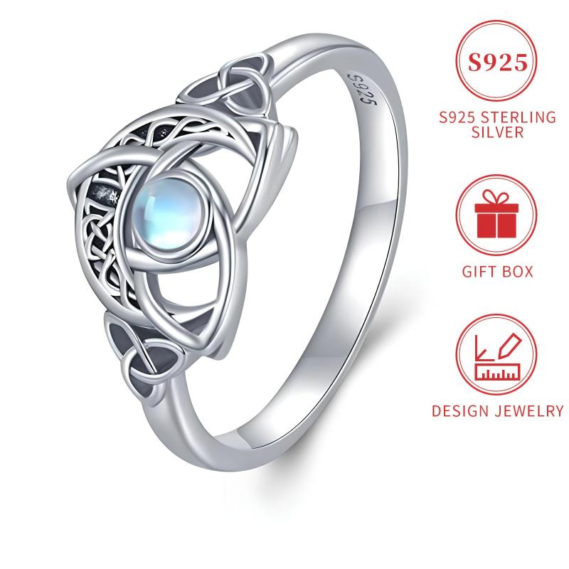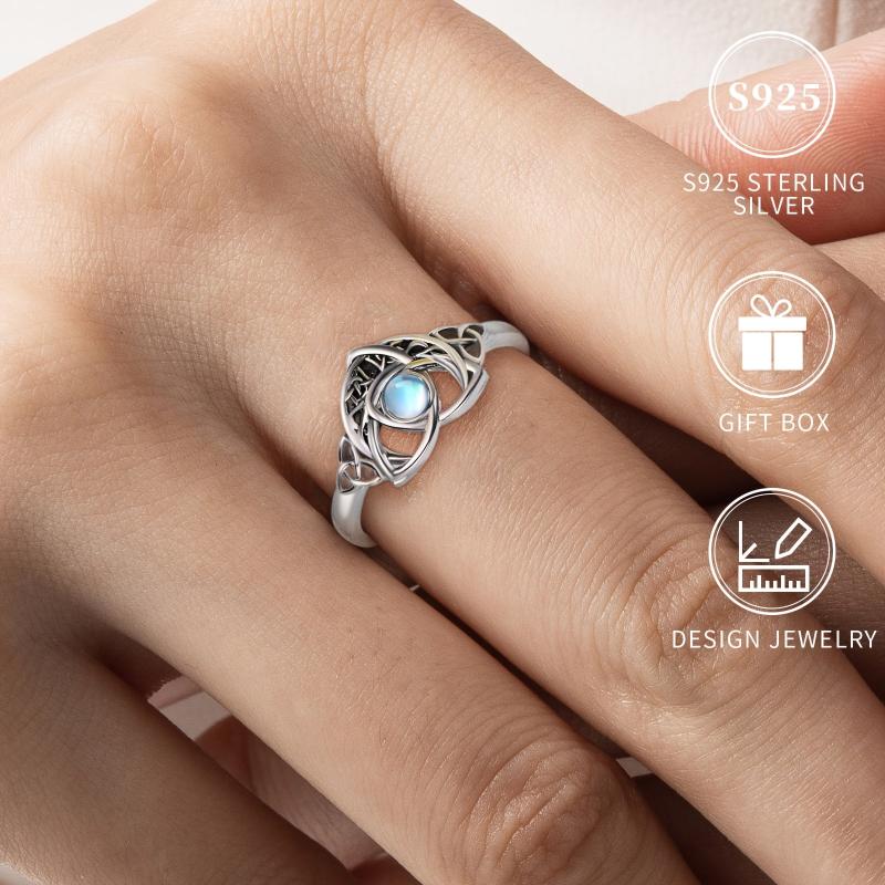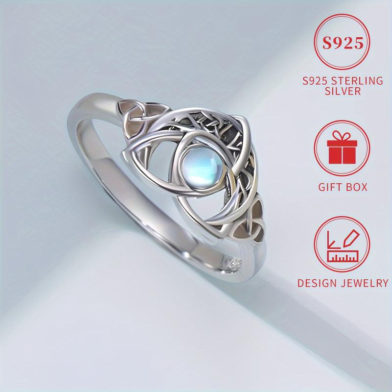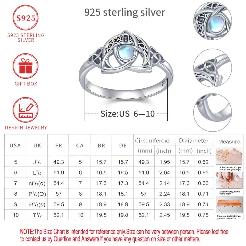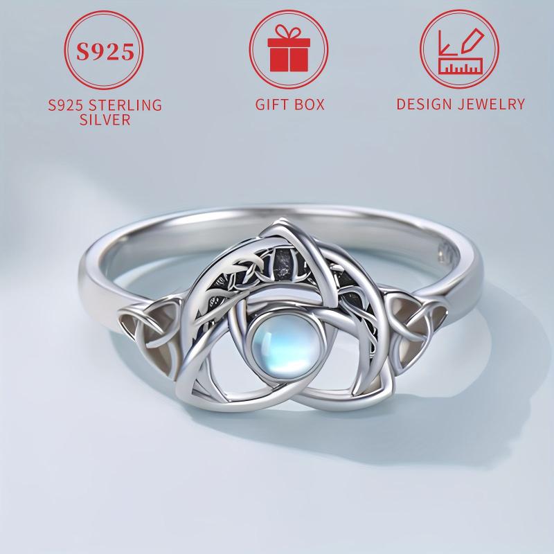 This beautiful ring features a Celtic knot design with a synthetic moonstone set in silver plated 925 silver. It is lightweight at 2.5g and suitable for all seasons. Perfect for gifting during Christmas or any occasion. Hypoallergenic and nickel-free, making it safe for daily wear or parties.