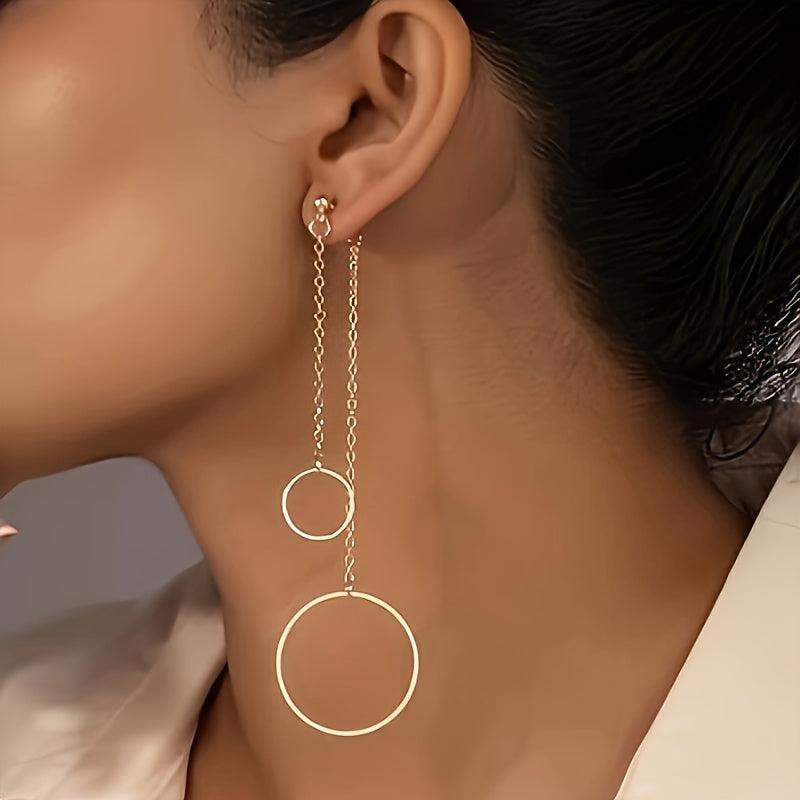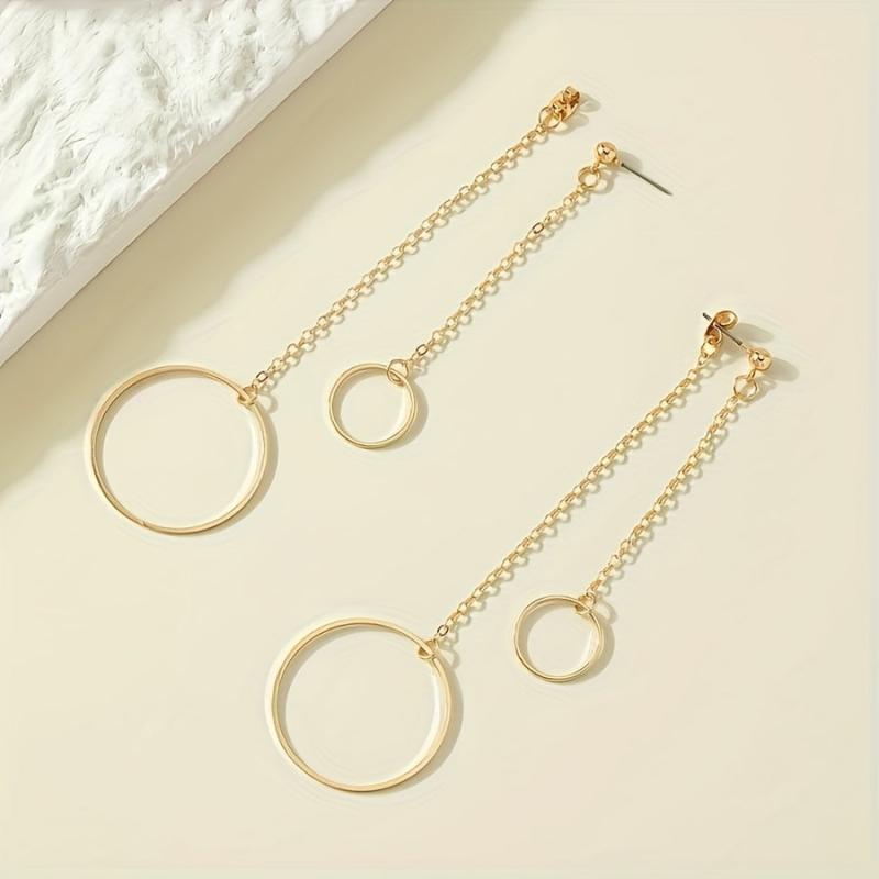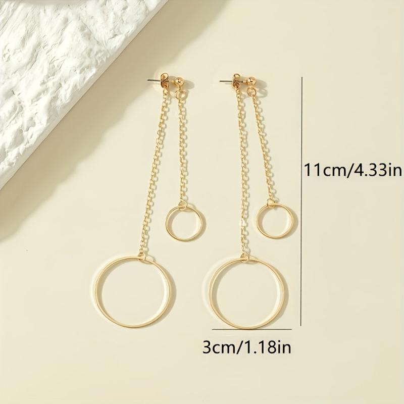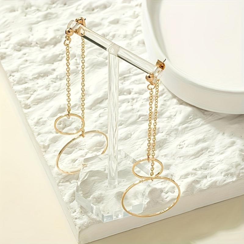 Add a touch of glamour to your daily commute with these stylish dangle earrings featuring metal rings with chain drops.