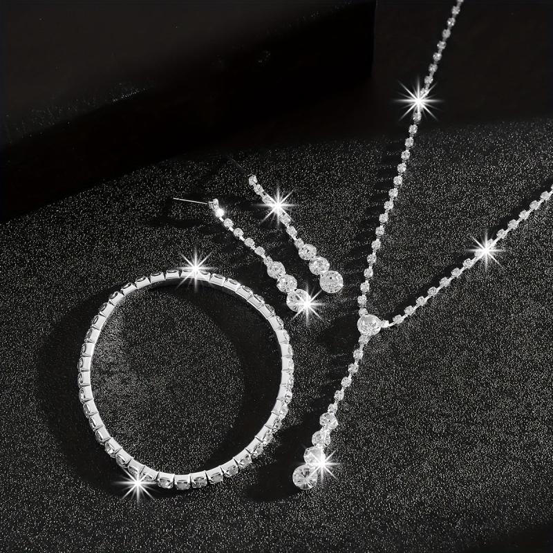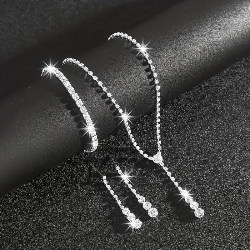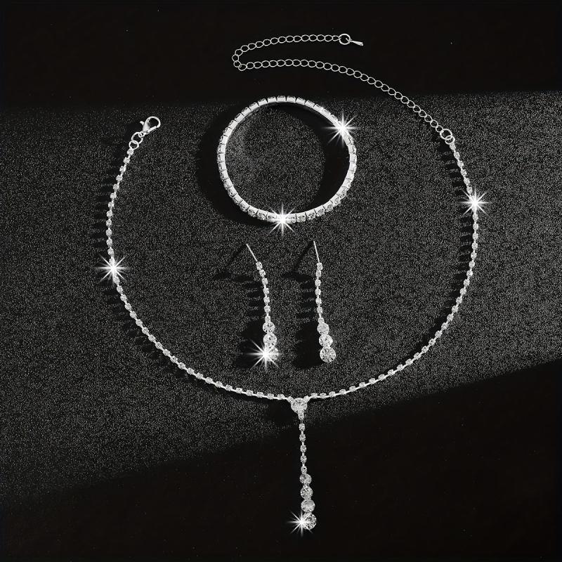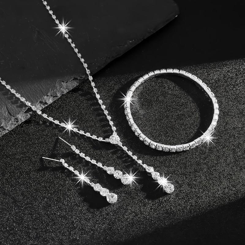 This elegant jewelry set includes a long necklace, earrings, and bracelet adorned with sparkling gemstones. Perfect for weddings or daily wear, this set adds a touch of glamour to any outfit.