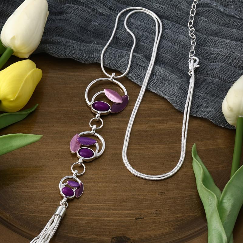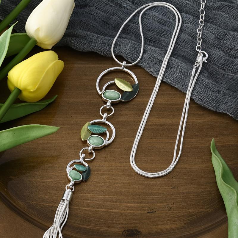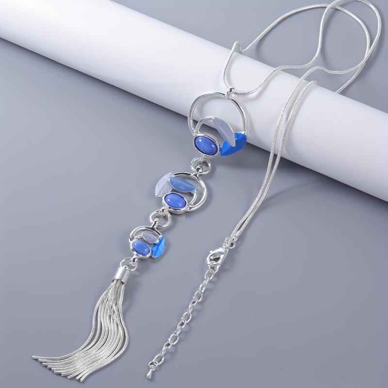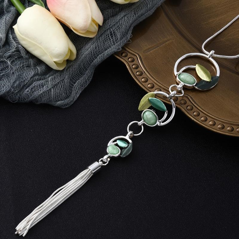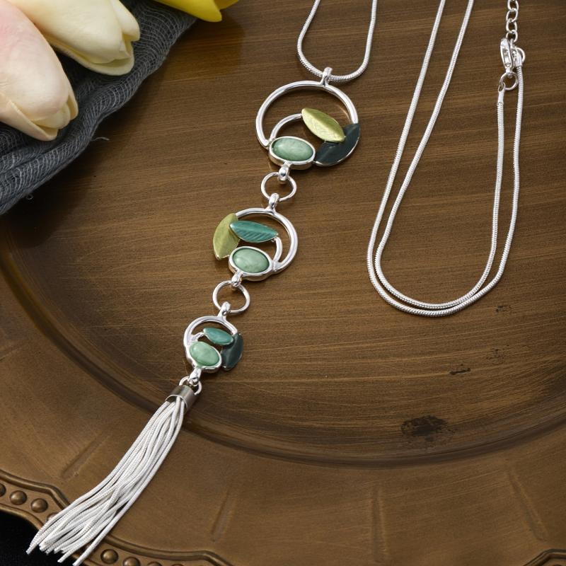 Add a touch of elegance to your winter outfits with this long geometric sweater chain necklace featuring fringe leaf resin details. Makes a perfect gift for the holiday season!