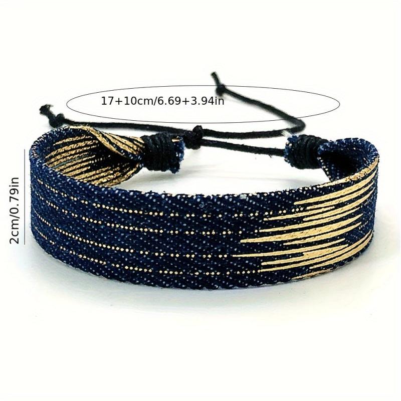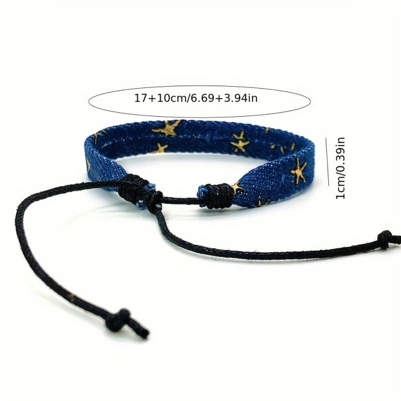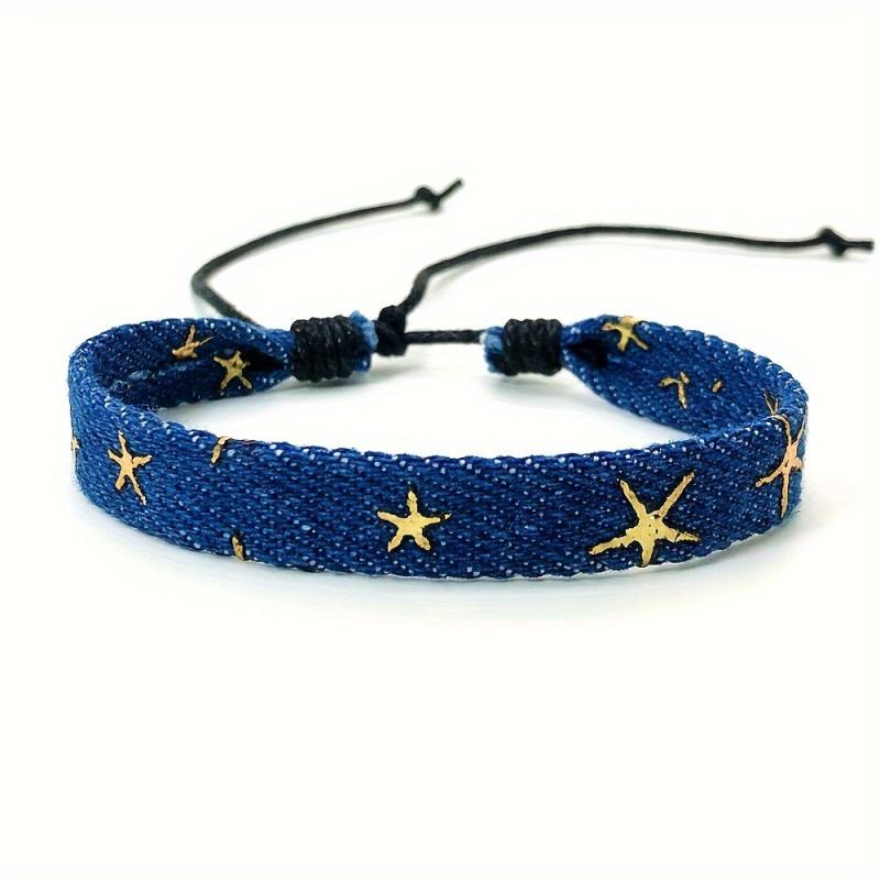 Upgrade your daily style with this classic woven denim bracelet featuring a star pattern. Adjust the fit to suit your style and enjoy this versatile accessory all year round.