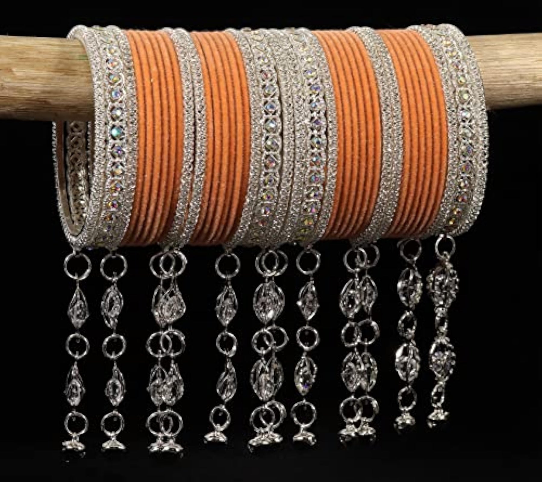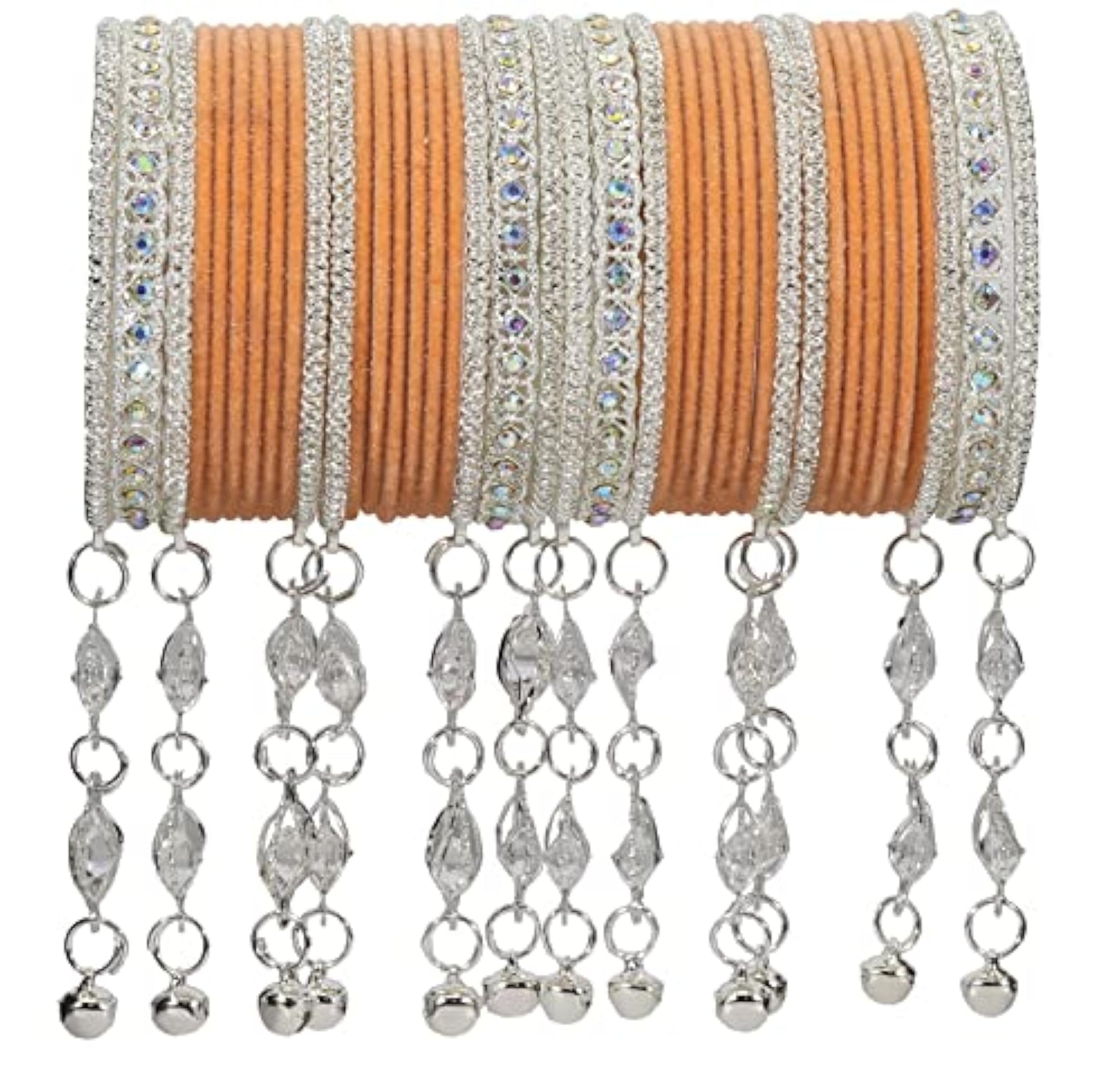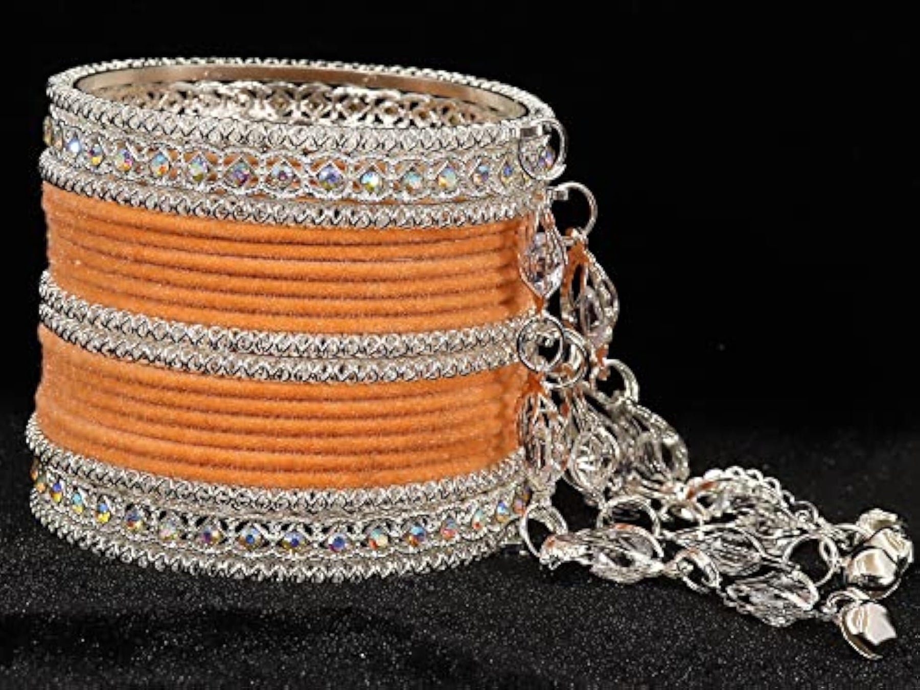 Elegant velvet bangles adorned with zircon gemstones and bells latkan for women and girls. Set includes 40 bangles, each measuring 2.6 inches in diameter.