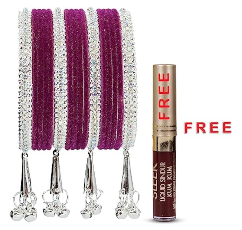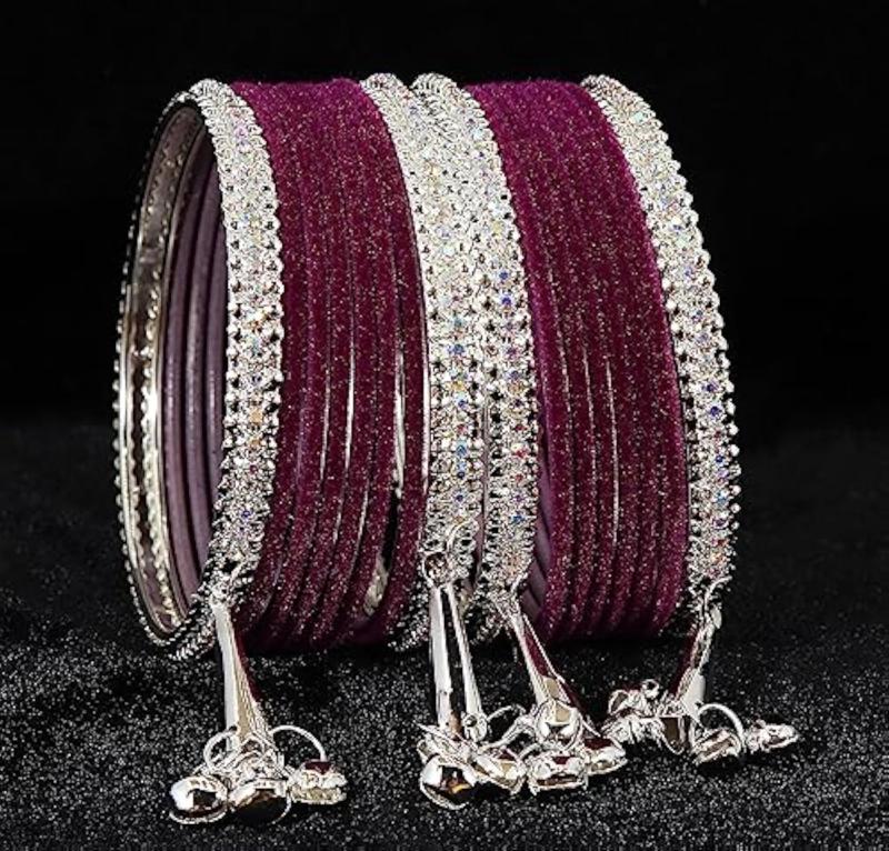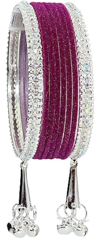 Elegant set of silver metal bangles adorned with zircon gemstones and velvet studded bells latkan. Perfect for adding a touch of glamour to your outfit.
