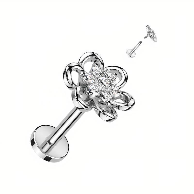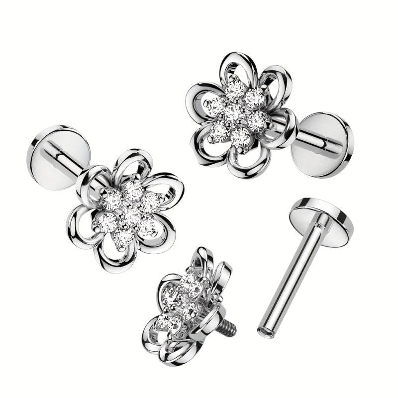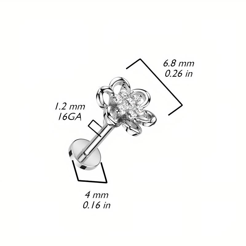 Elegant and modern stainless steel ear stud featuring a flower design with small zirconia stones. Perfect for adding a touch of personality to your look.
