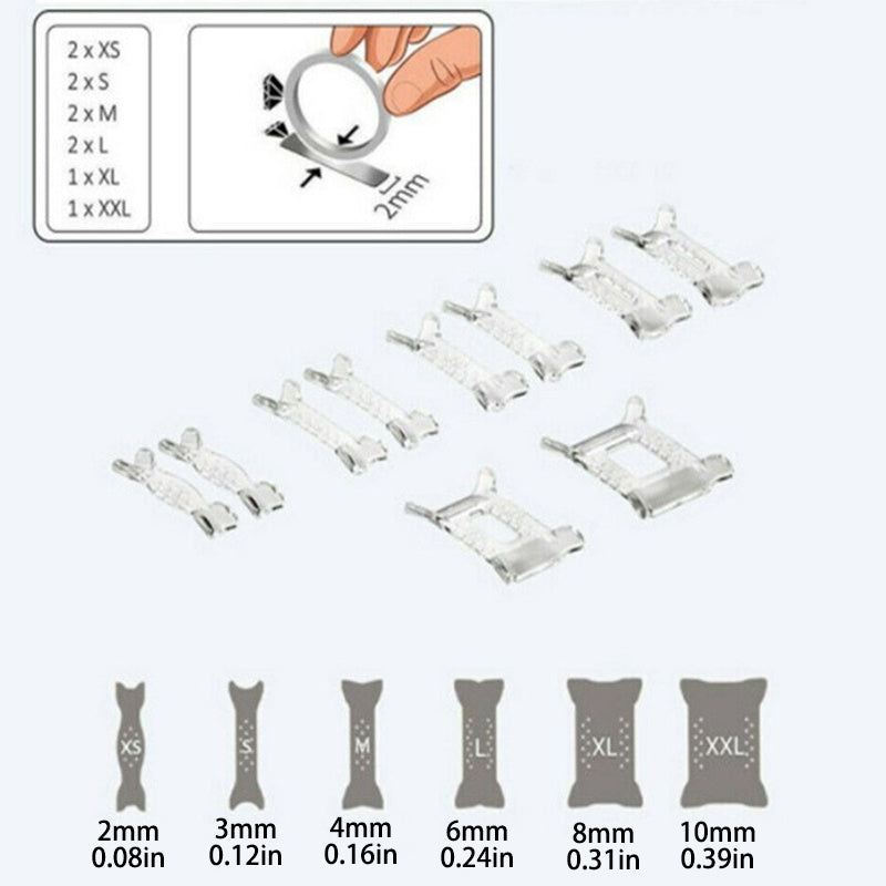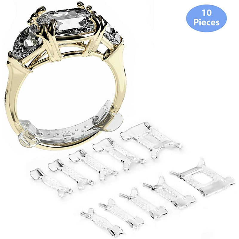 This pack contains 10 pieces of transparent plastic ring size adjusters in 6 different sizes to help you with loose rings.