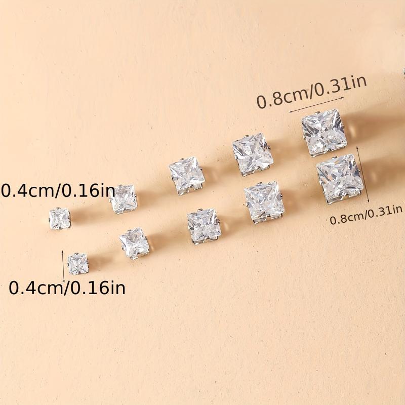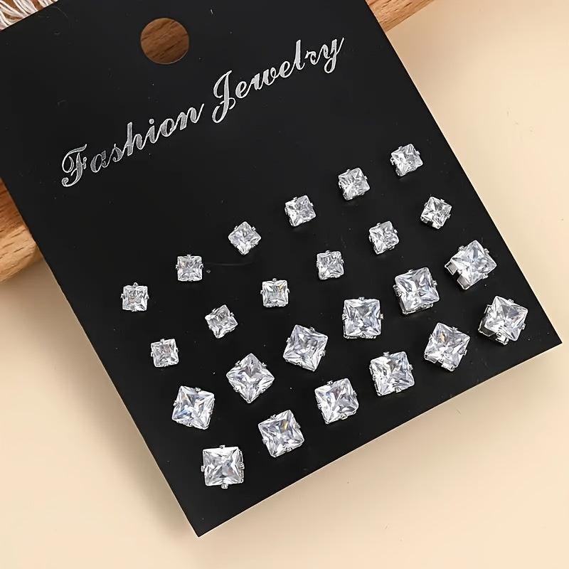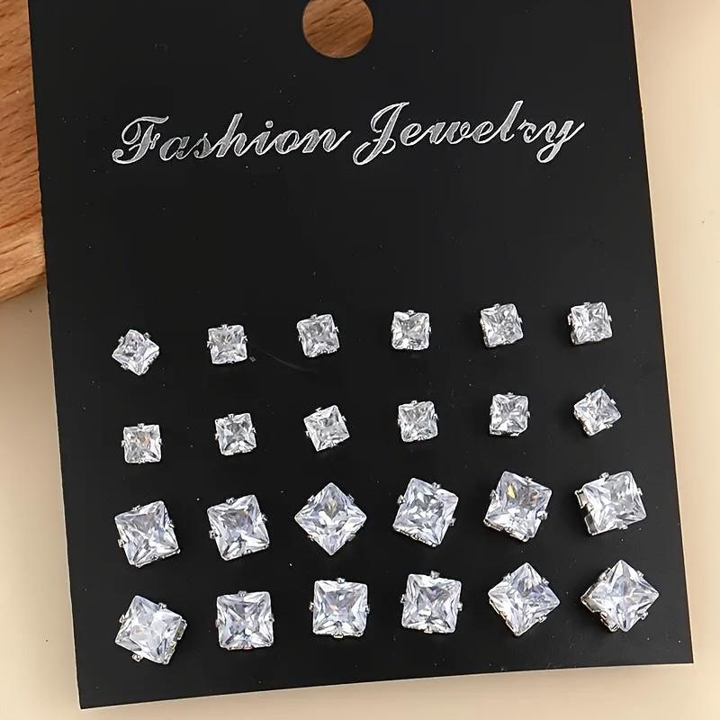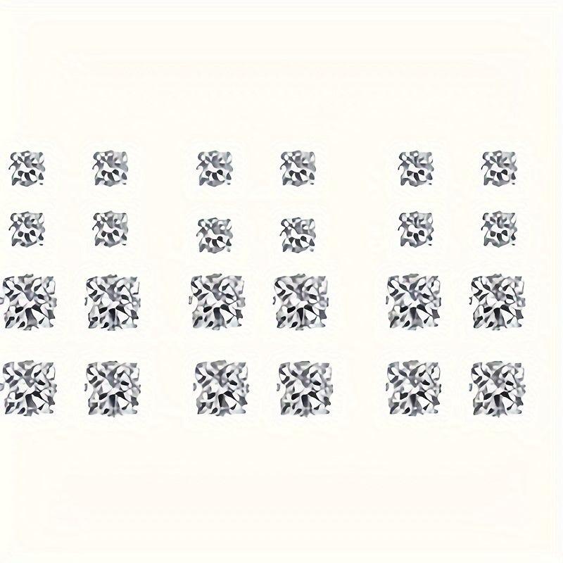 These stud earrings are made of stainless steel with CZ stones, perfect for men with sensitive ears. The set includes 12 pairs of earrings in various sizes.