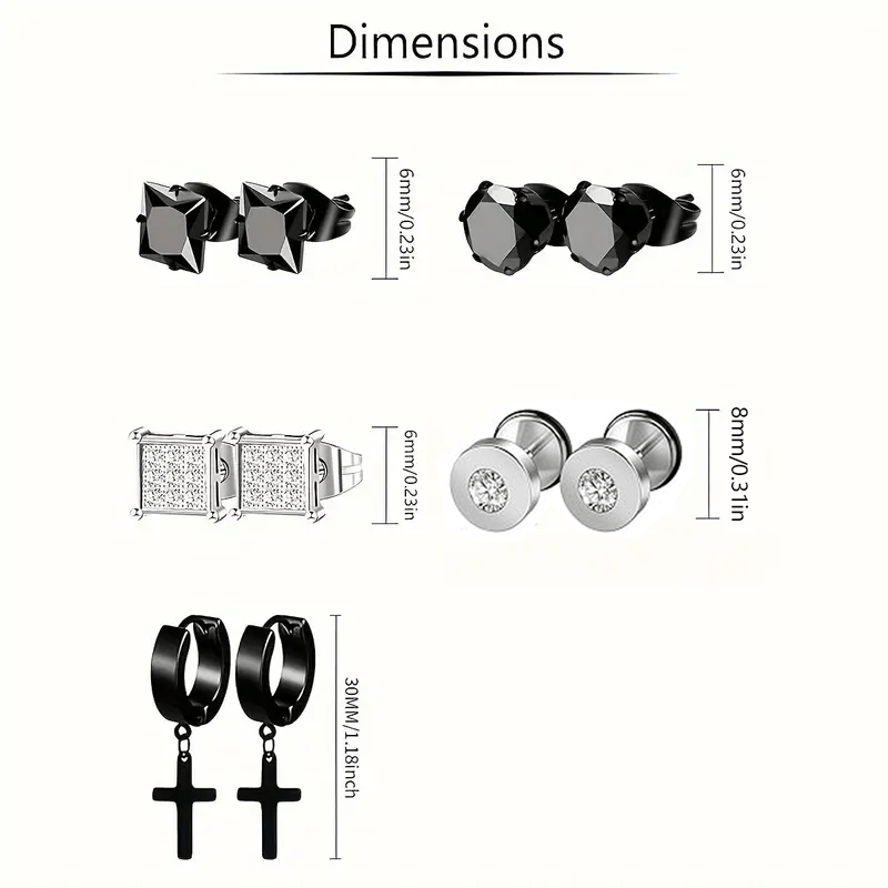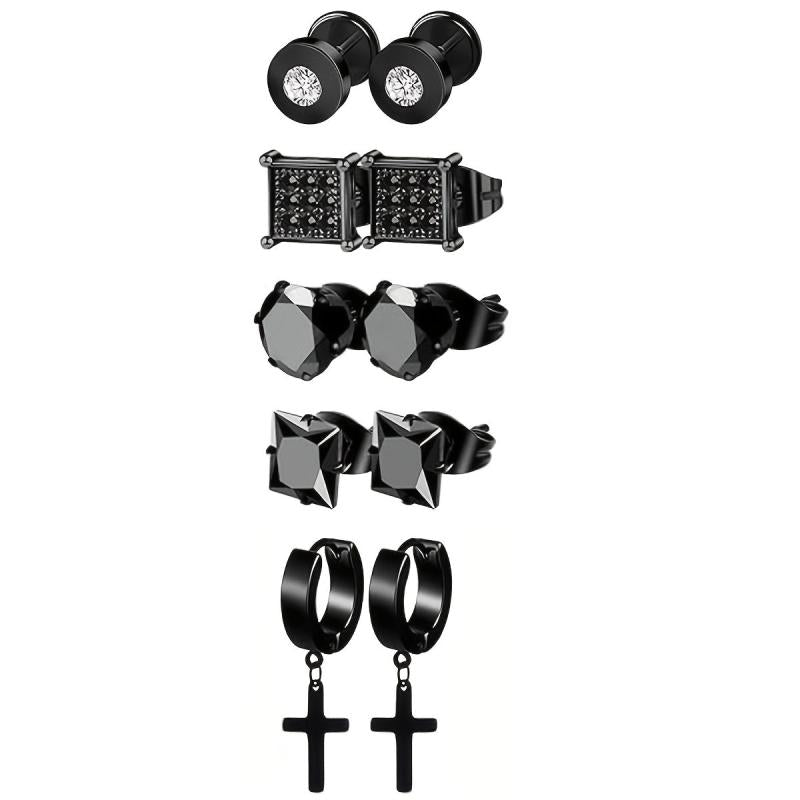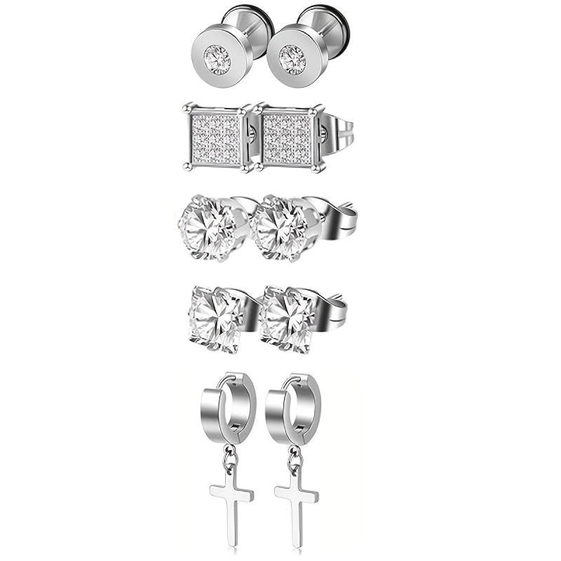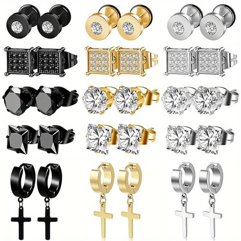 This set includes 15 pairs of stainless steel earrings featuring various designs like studs, dangles, crosses, and huggies. The earrings are hypoallergenic, suitable for men and women.