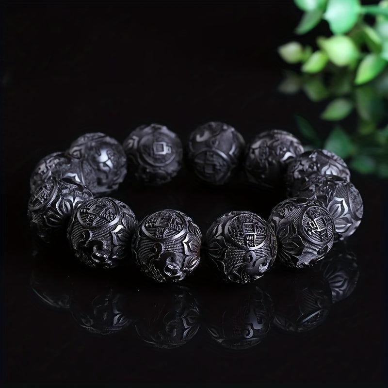 This classic Chinese style bracelet features hand-carved 20mm wooden beads and a prosperity charm. It comes in a gift box, making it a perfect present for loved ones.