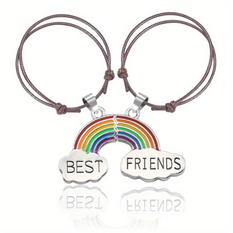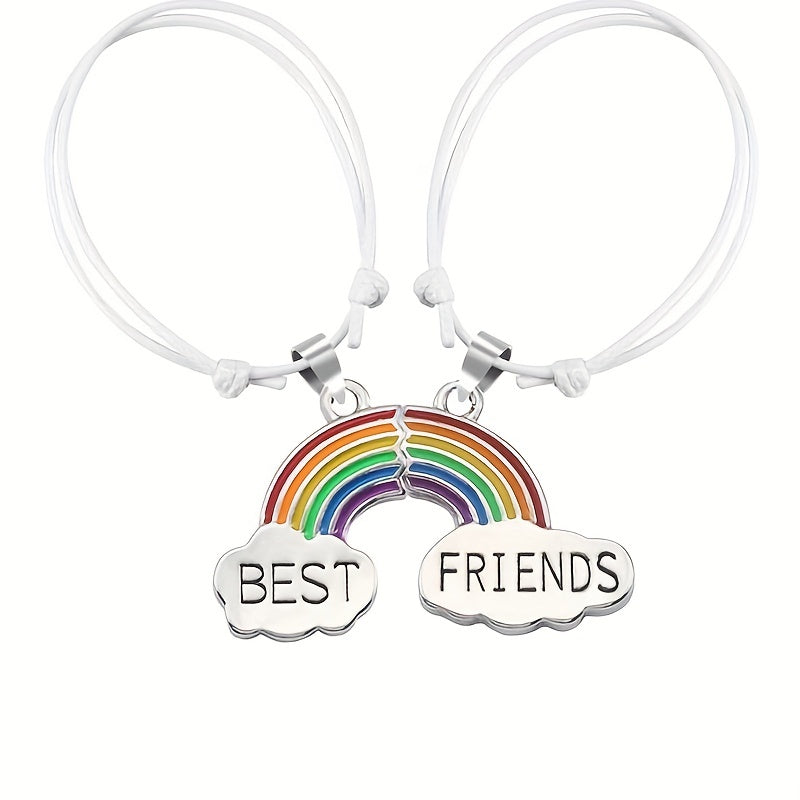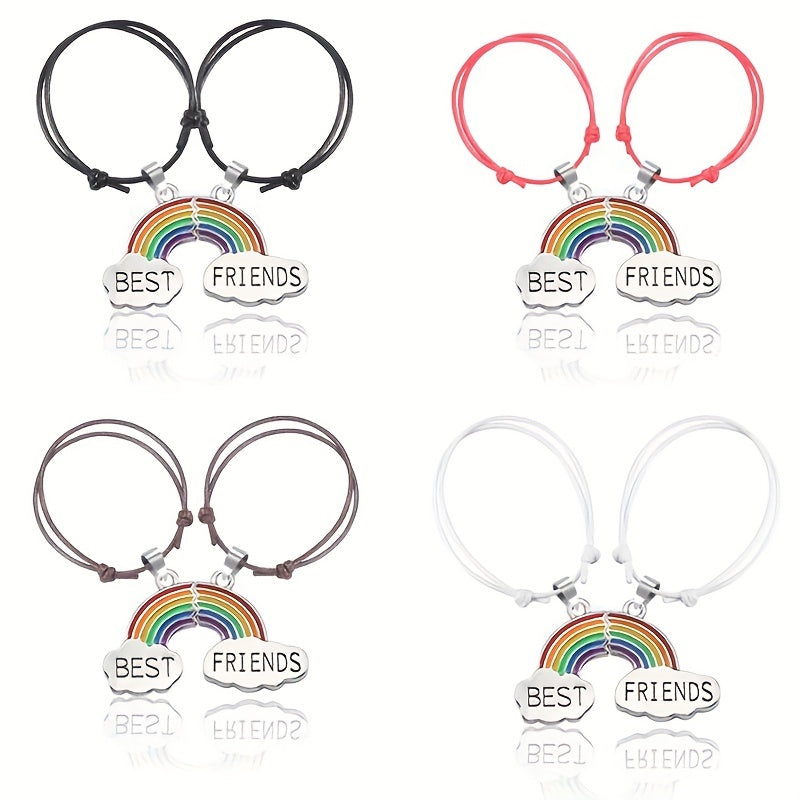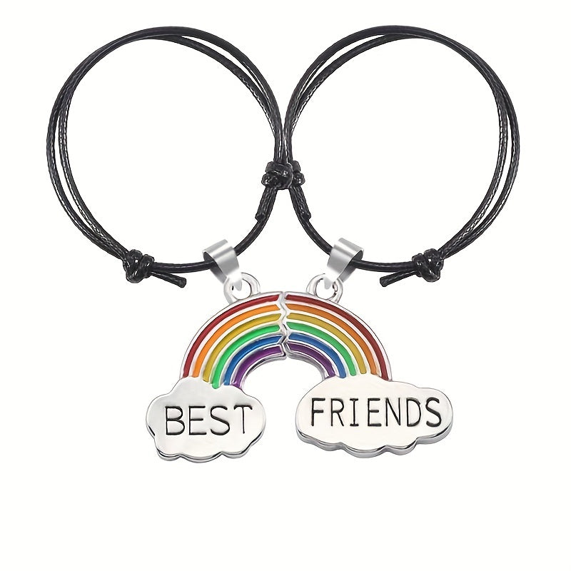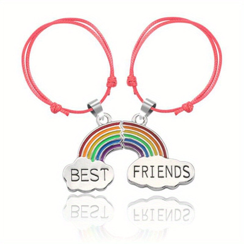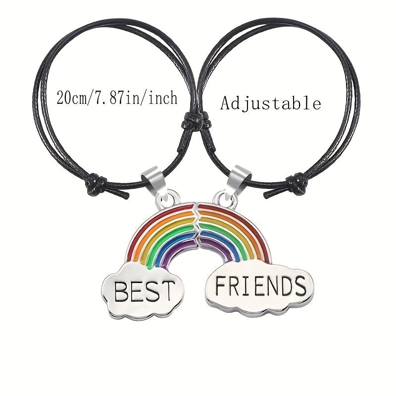 Get this set of 2 braided cord bracelets with matching heart-shaped rainbow BFF pendants. Adjustable design for a perfect fit. Ideal as a friendship gift or for showing your love and connection.