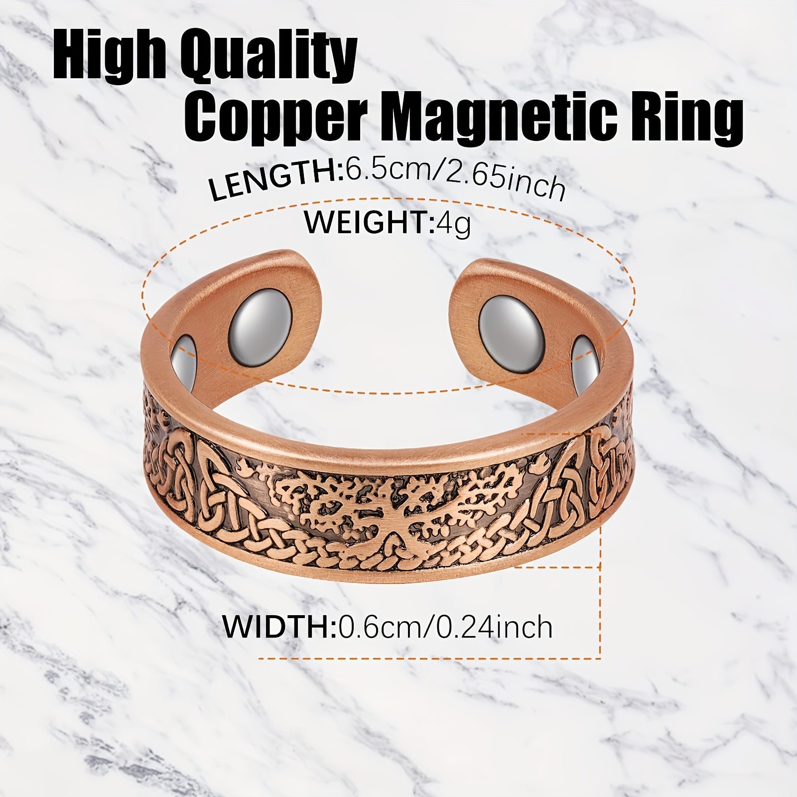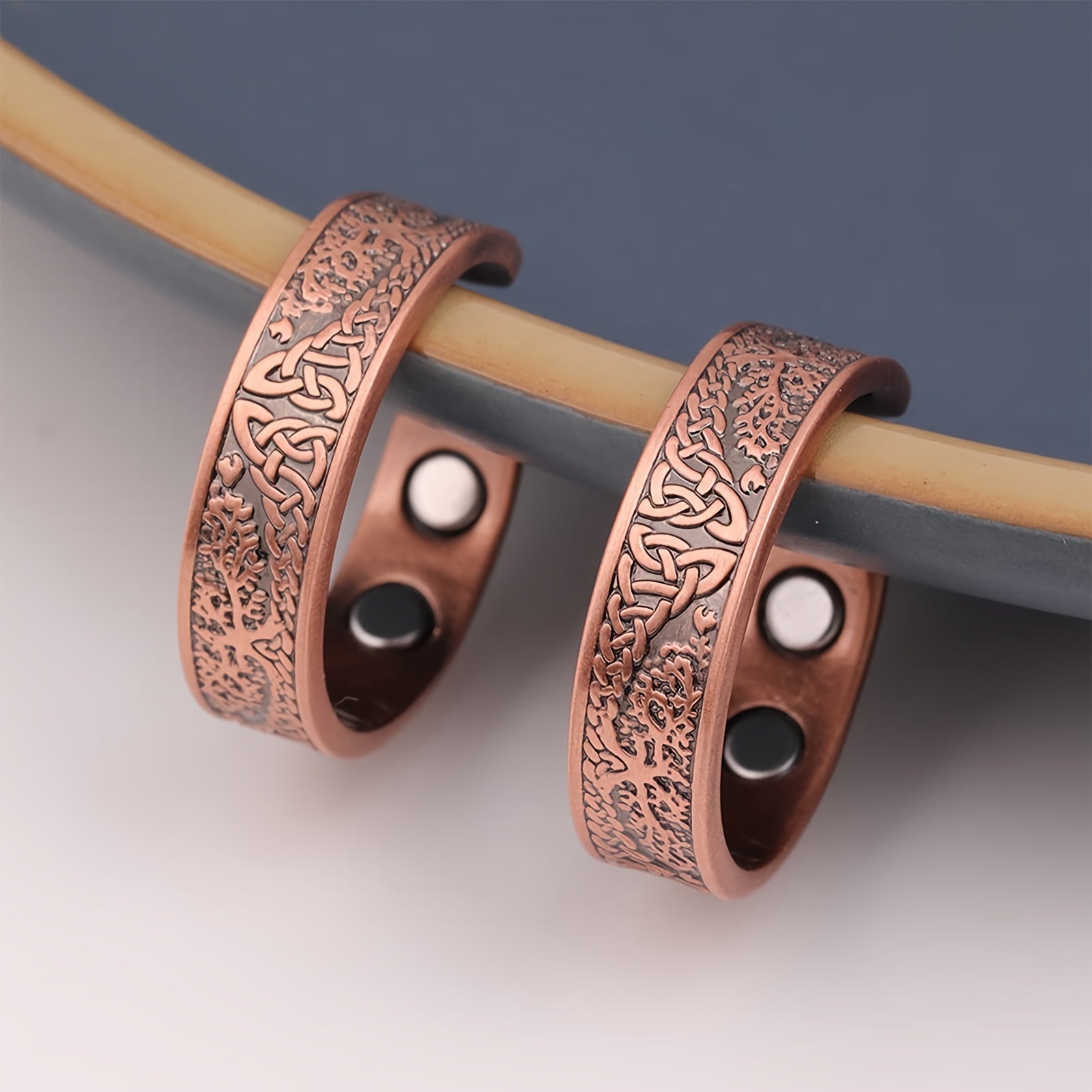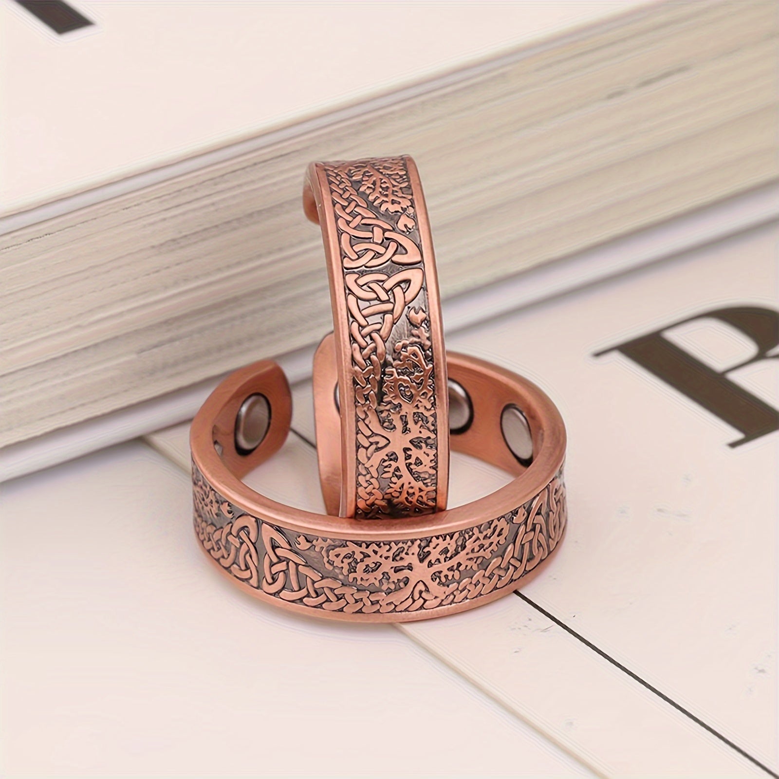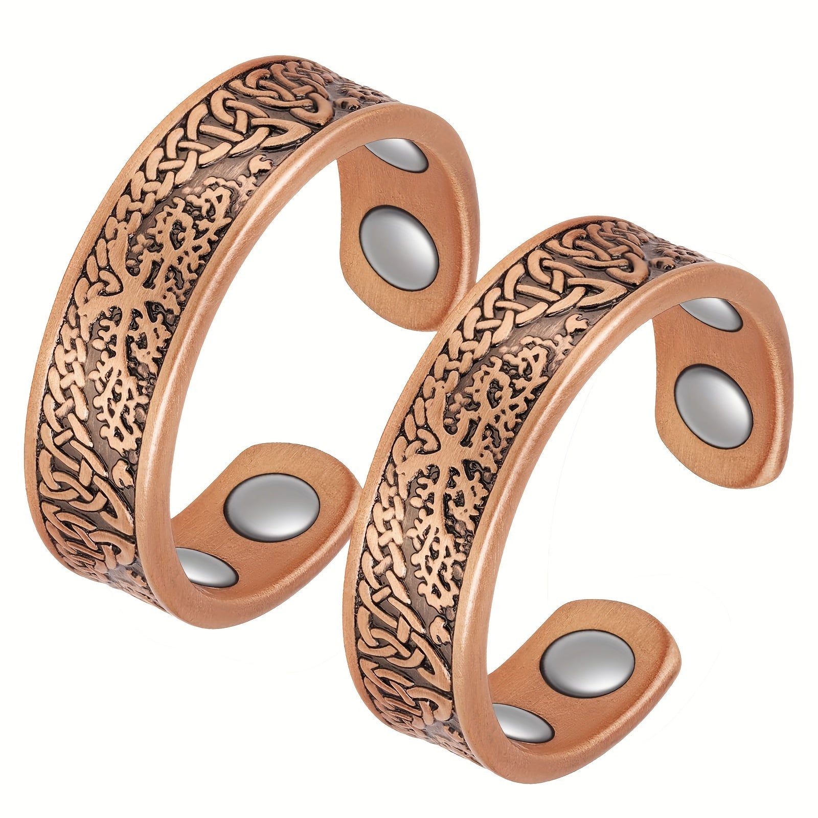 These adjustable rings are made of hypoallergenic solid copper with a beautiful Tree of Life design. Each ring contains 3500 Gauss magnets for potential health benefits.