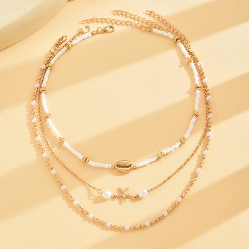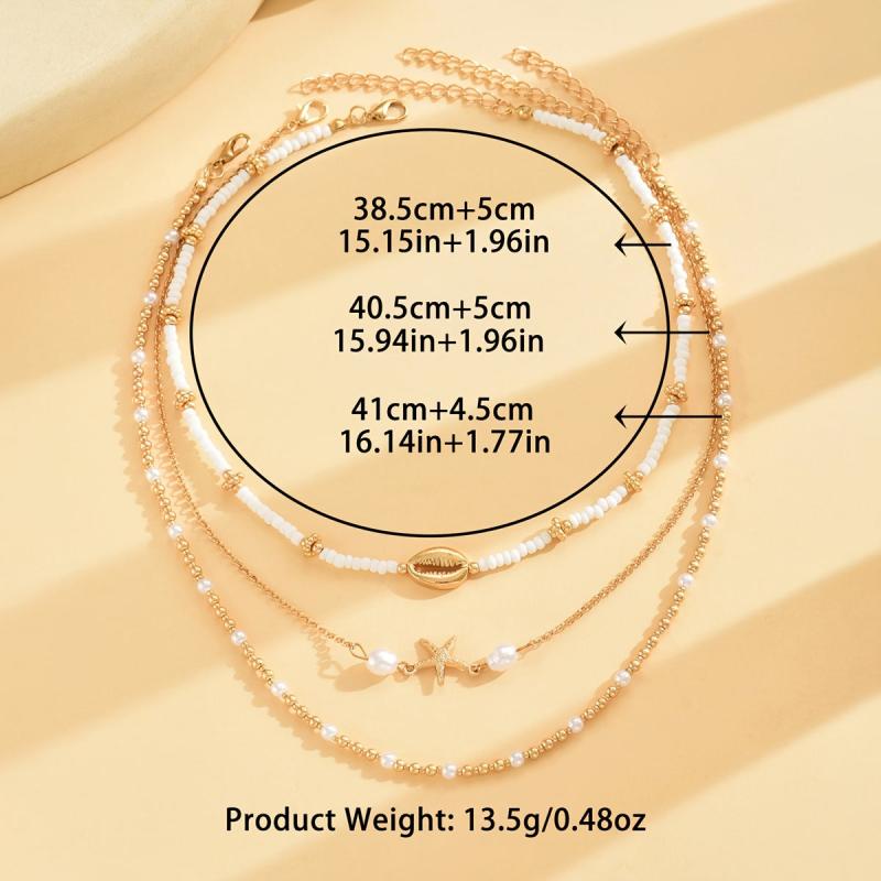 Elevate your seaside vacation look with this set of 3 bohemian choker necklaces featuring shell and starfish pendants, golden round beads, and retro style stacked beads.