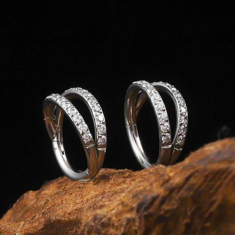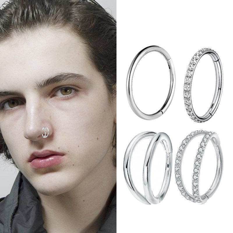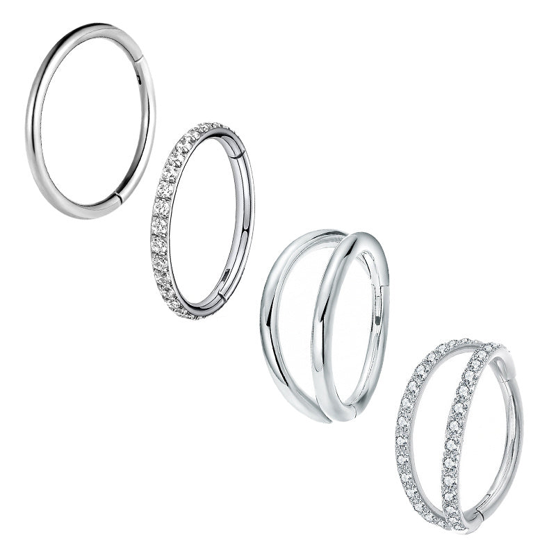 This set includes 4 16G nose rings made of surgical steel with CZ stones. Perfect for tragus, septum, conch, lip, cartilage piercings. Features hinged segment design.