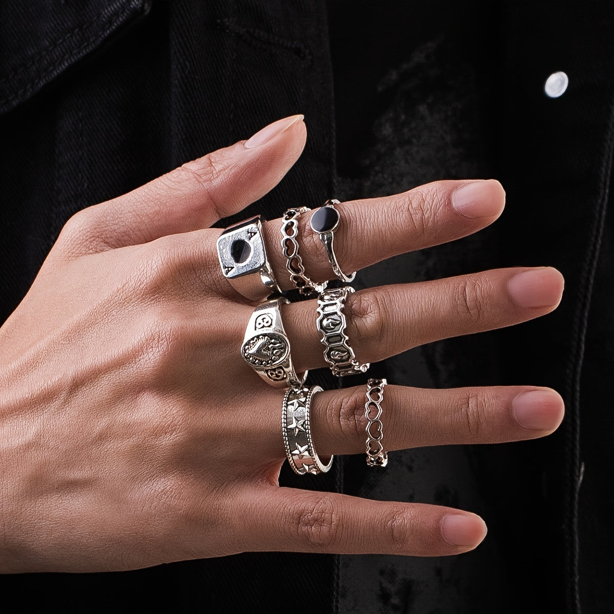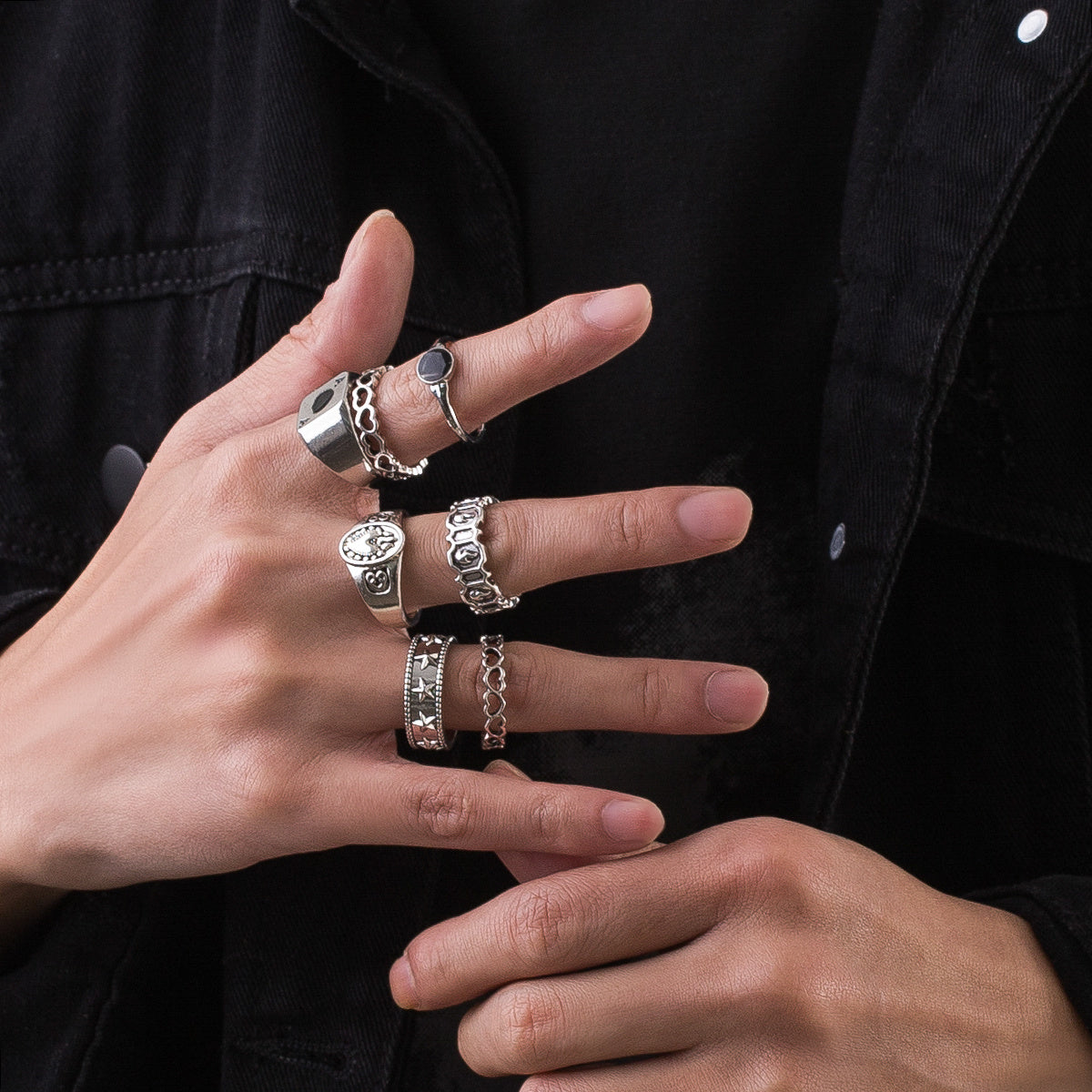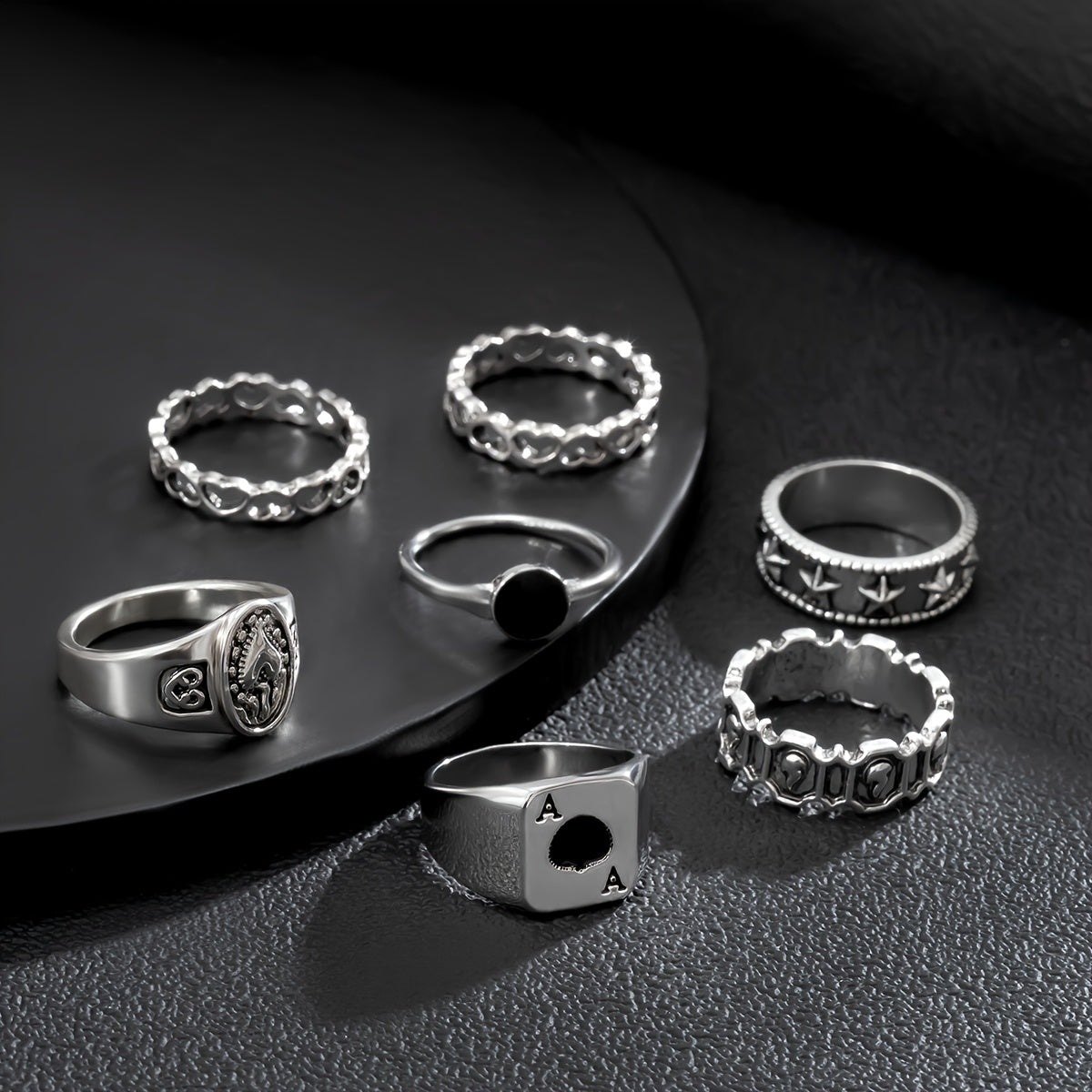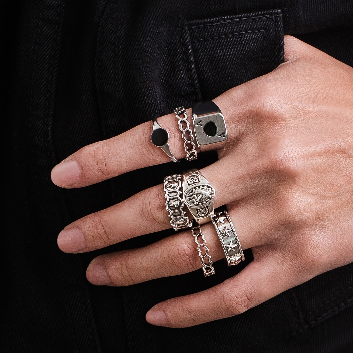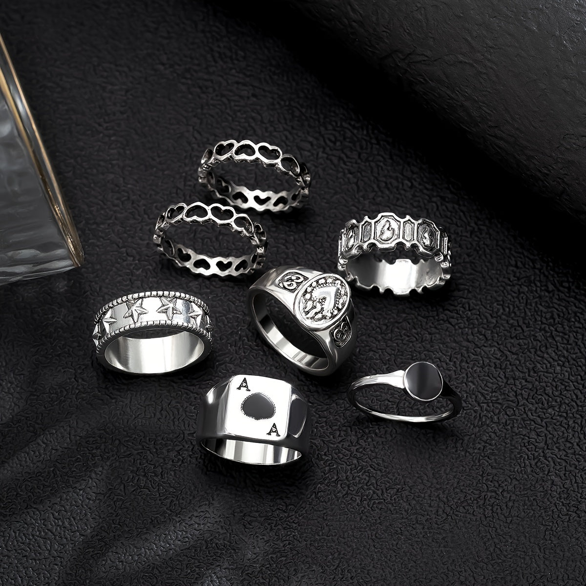 This set of 7 rings features a retro design with hollow love element charms for men.