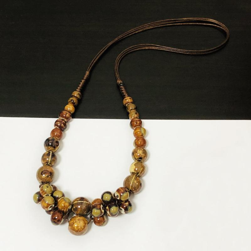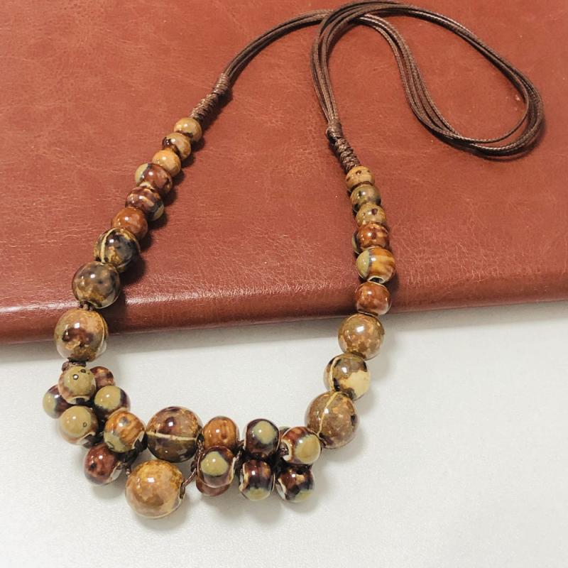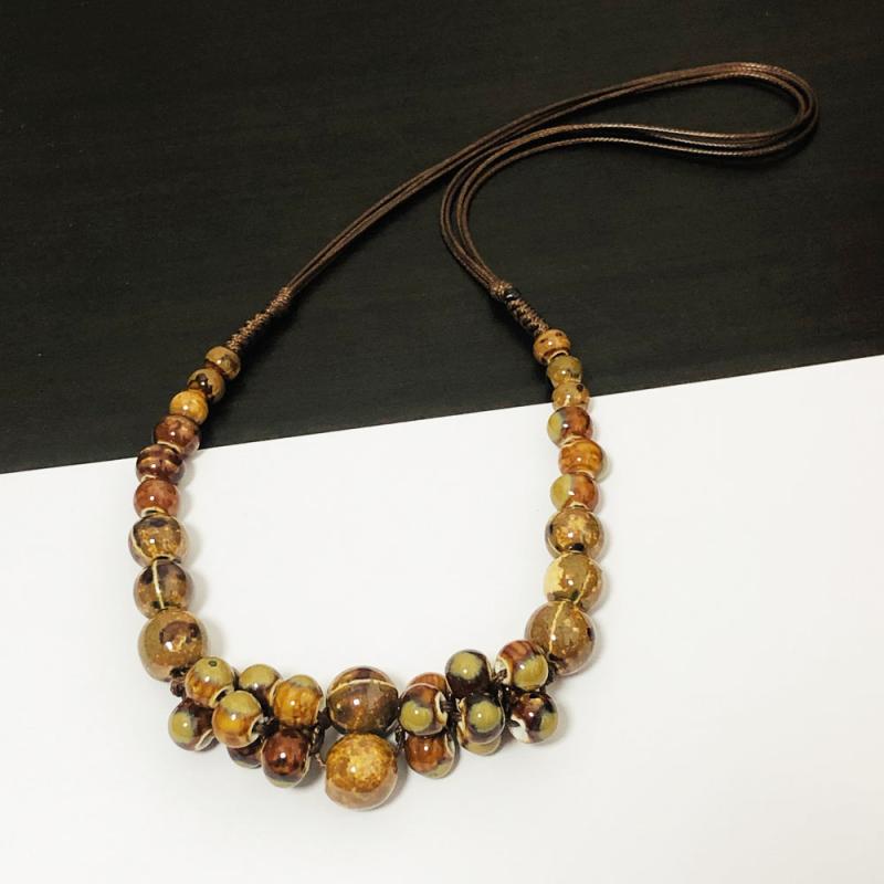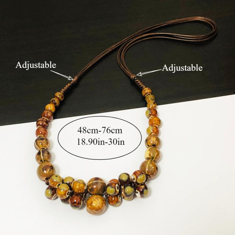 This adjustable collarbone necklace features retro ceramic beads in brown hues. Handwoven with an ethnic design, this unique jewelry piece is perfect for women and makes a great gift for mothers. Suitable for everyday wear or special occasions.