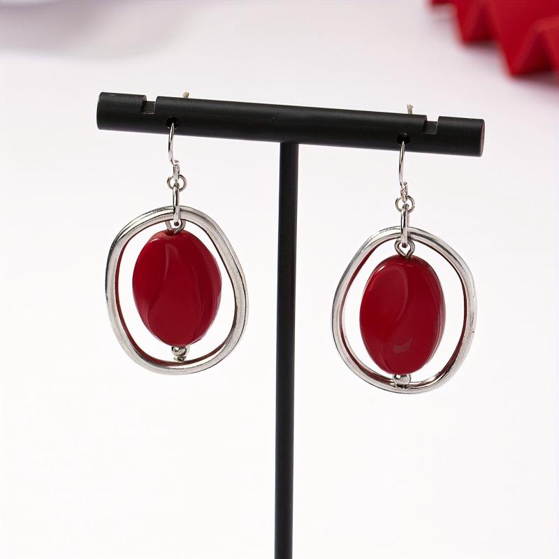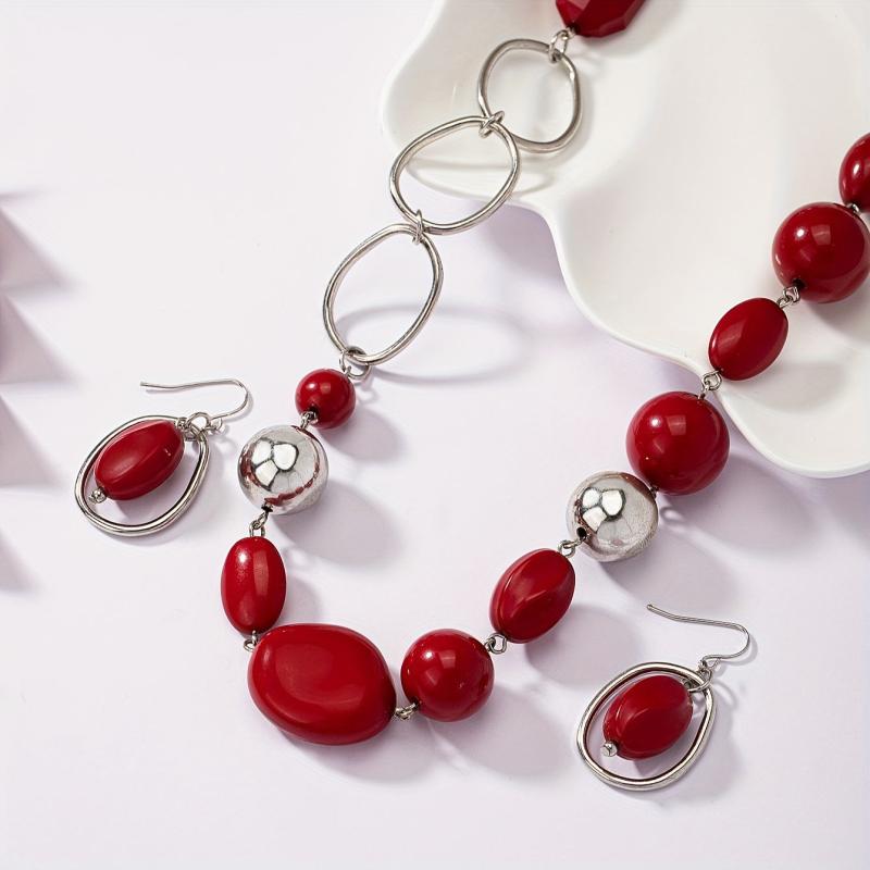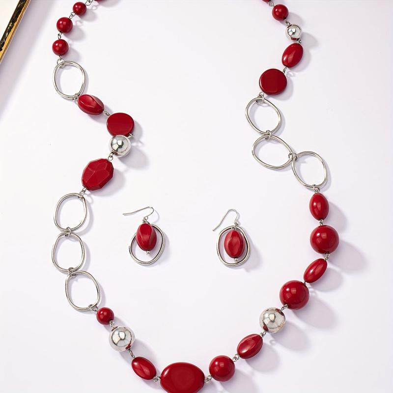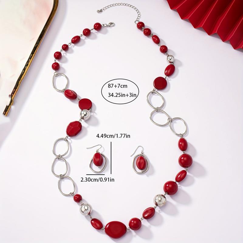 Elevate your style with this vintage bohemian set featuring a red long necklace, sweater chain, and matching earrings.