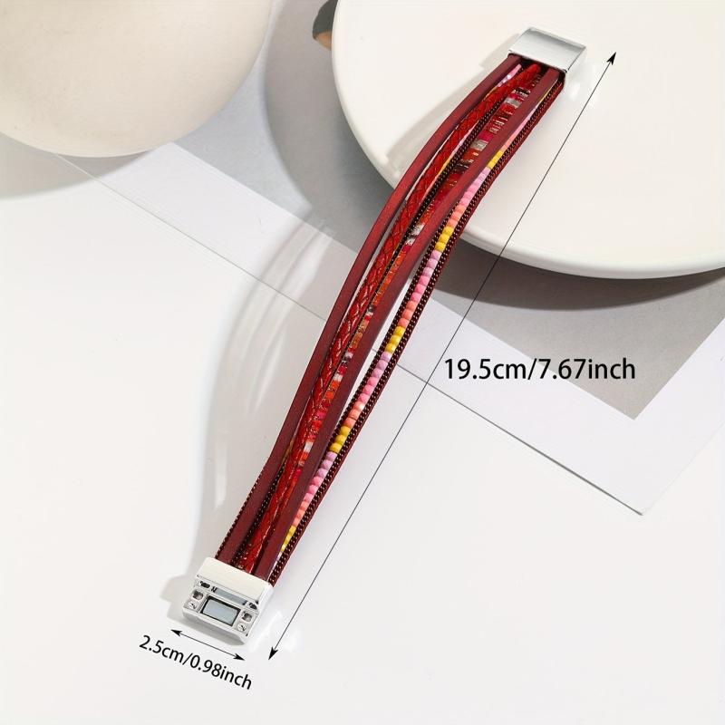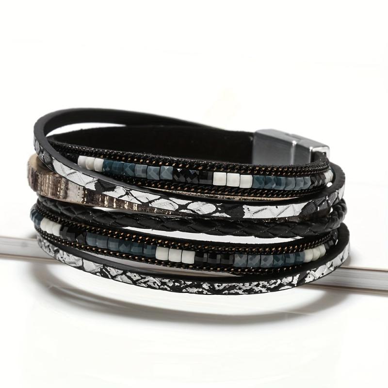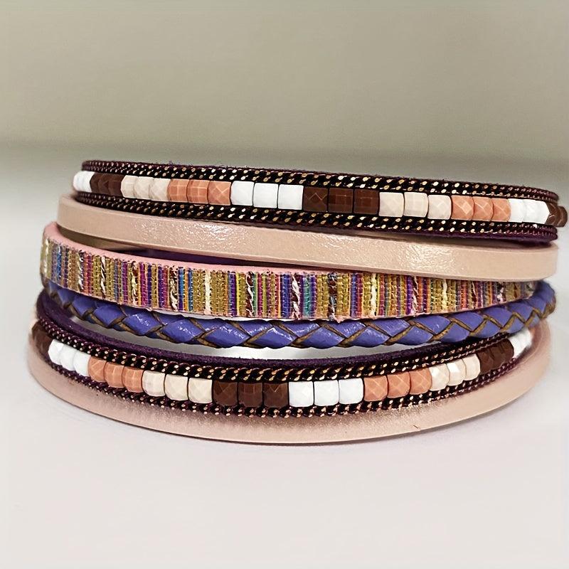 This boho PU leather bracelet features a magnetic clasp and is layered in brown and beige colors with a retro bohemian style. Perfect for casual attire or as a gift.
