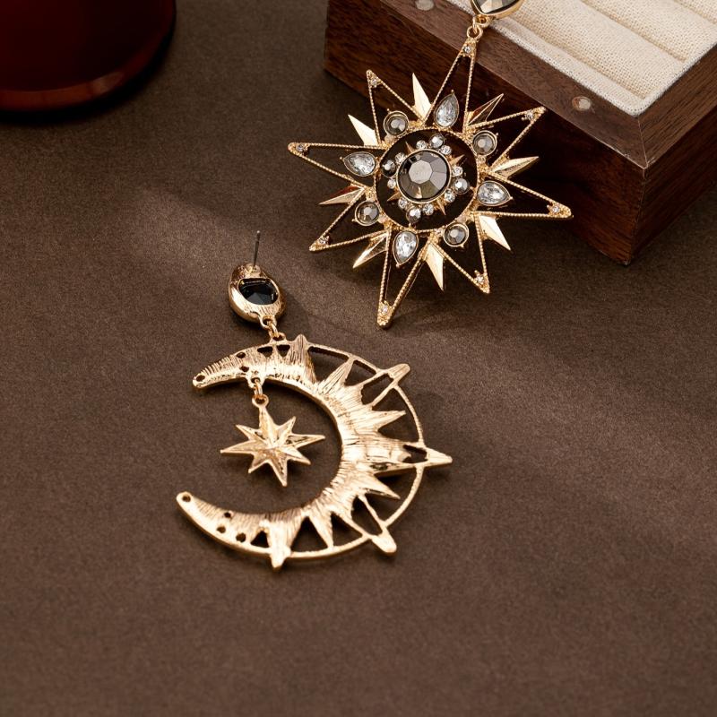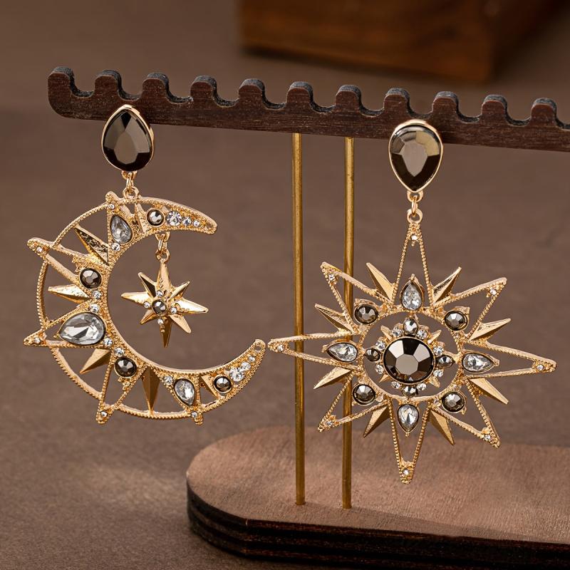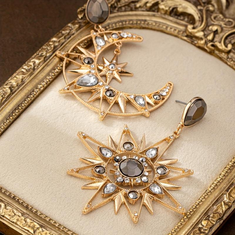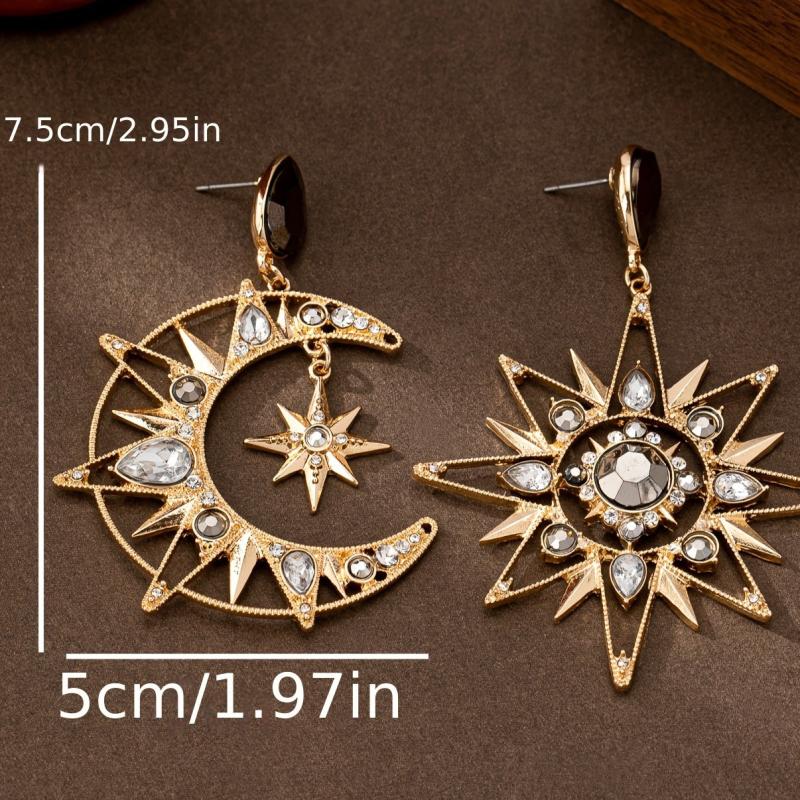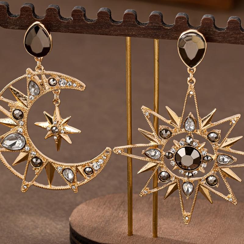 Add a touch of bohemian flair to your look with these sun and moon dangle earrings. The sparkling rhinestones and golden tone make them perfect for casual attire.