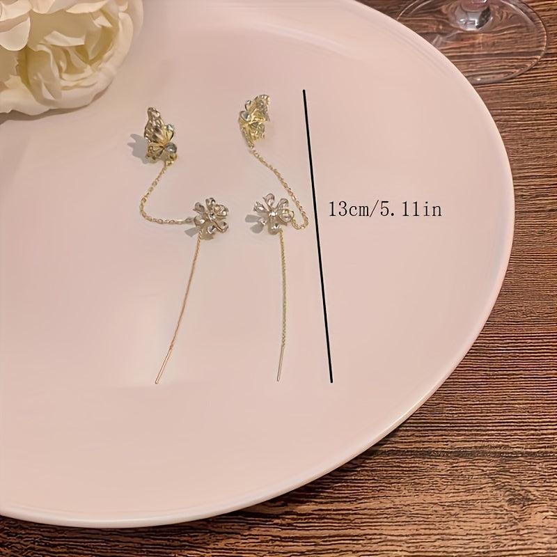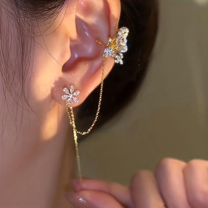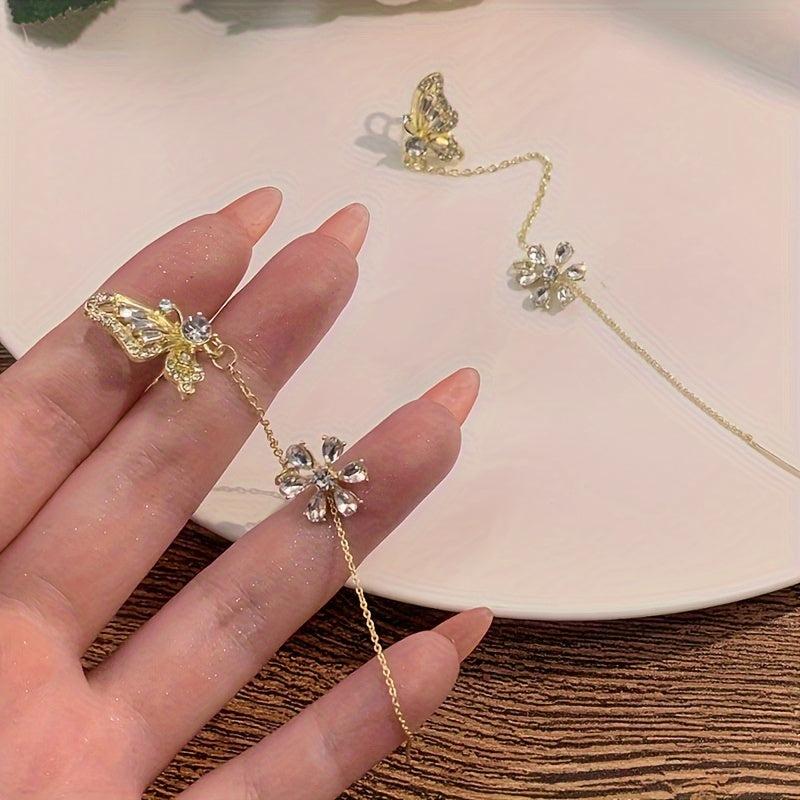 These butterfly rhinestone chain earrings are perfect for daily wear. Made of zinc alloy with stainless steel ear needles, they are non-piercing clip-ons suitable for cartilage.