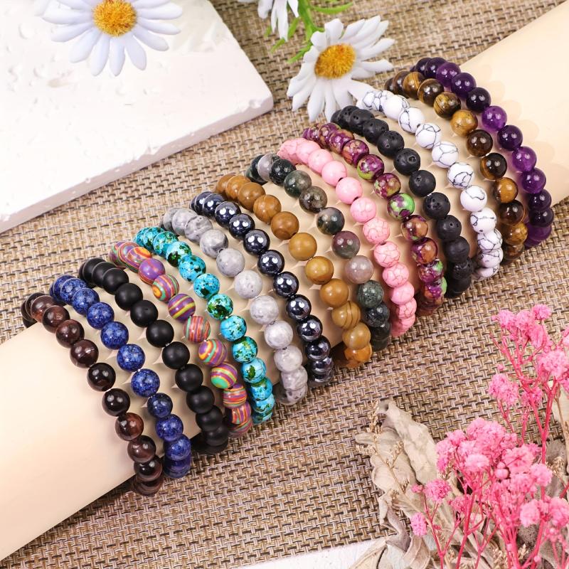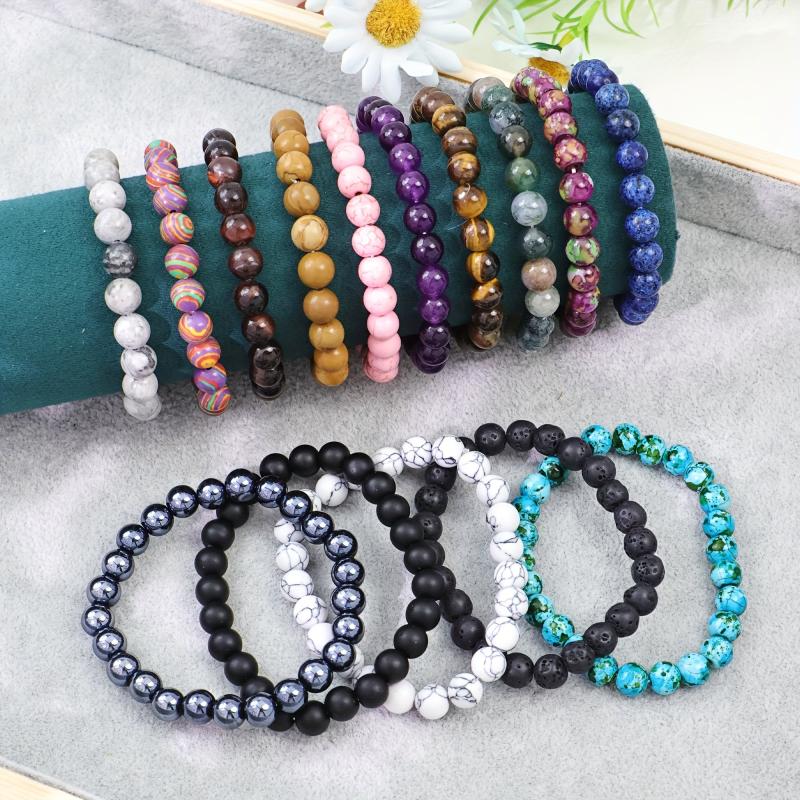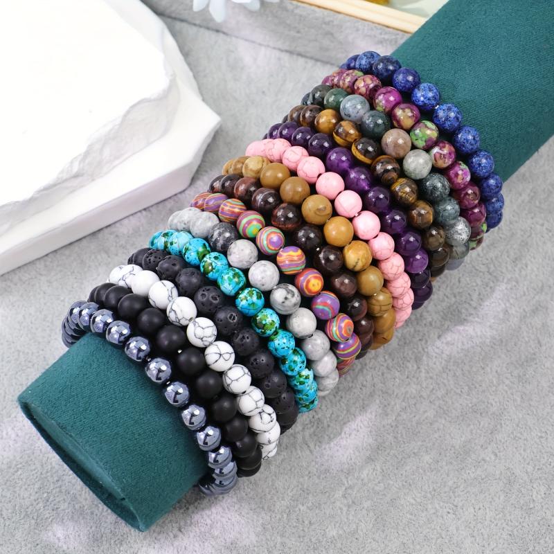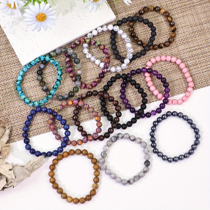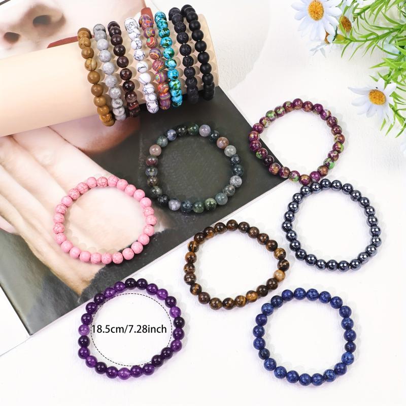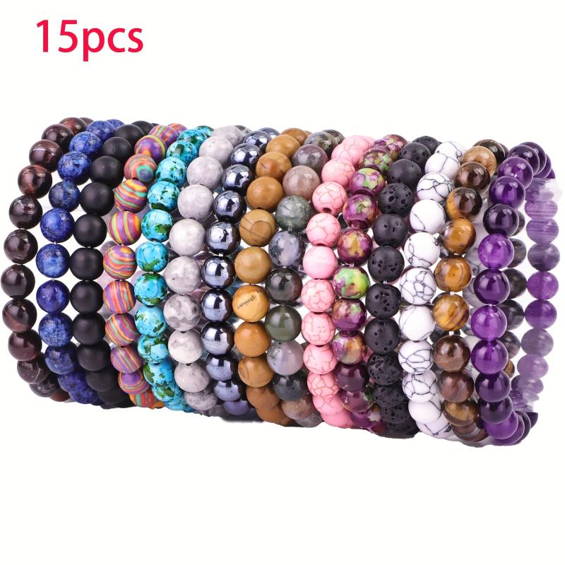 Enhance your style with these 15pcs colorful natural stone beaded bracelets. The 8mm round beads are strung on elastic for easy stretch and comfortable wear, suitable for both men and women. Perfect for daily wear and gift giving.