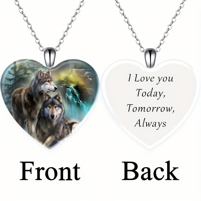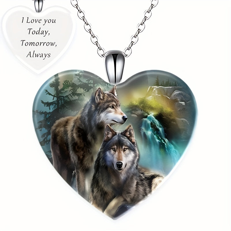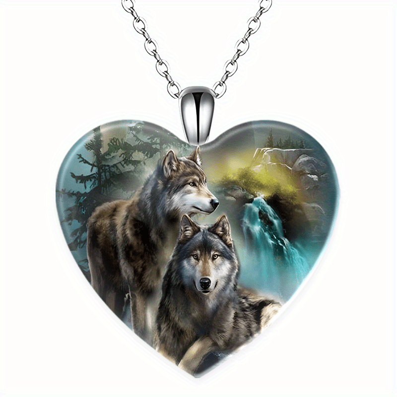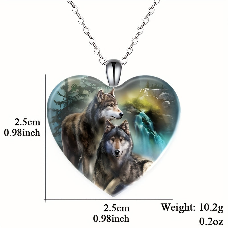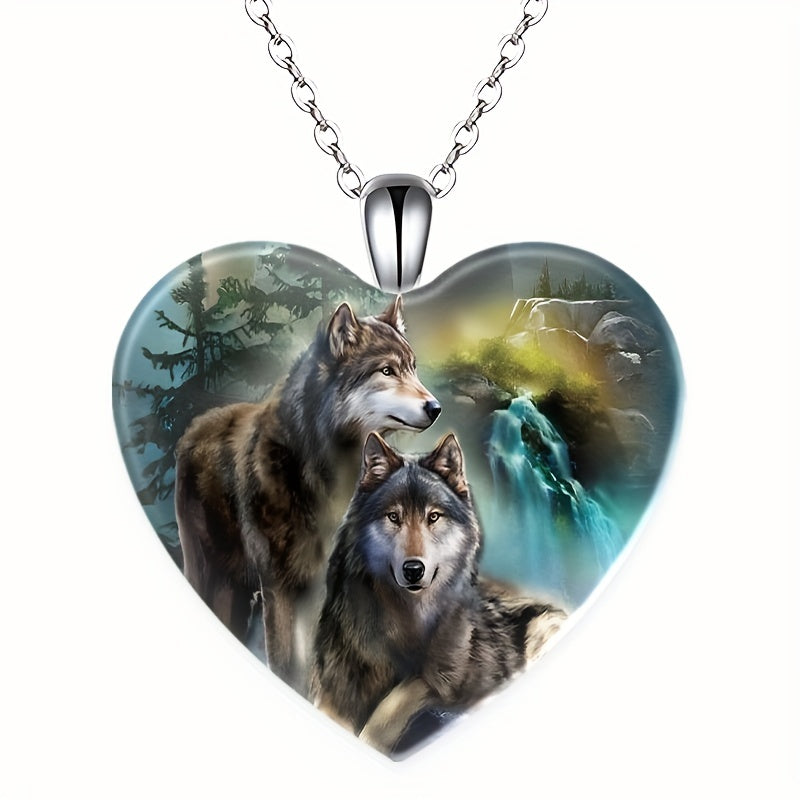 This retro pendant necklace features a double wolf print in a heart shape. Perfect for women and men, it makes a great accessory or gift.