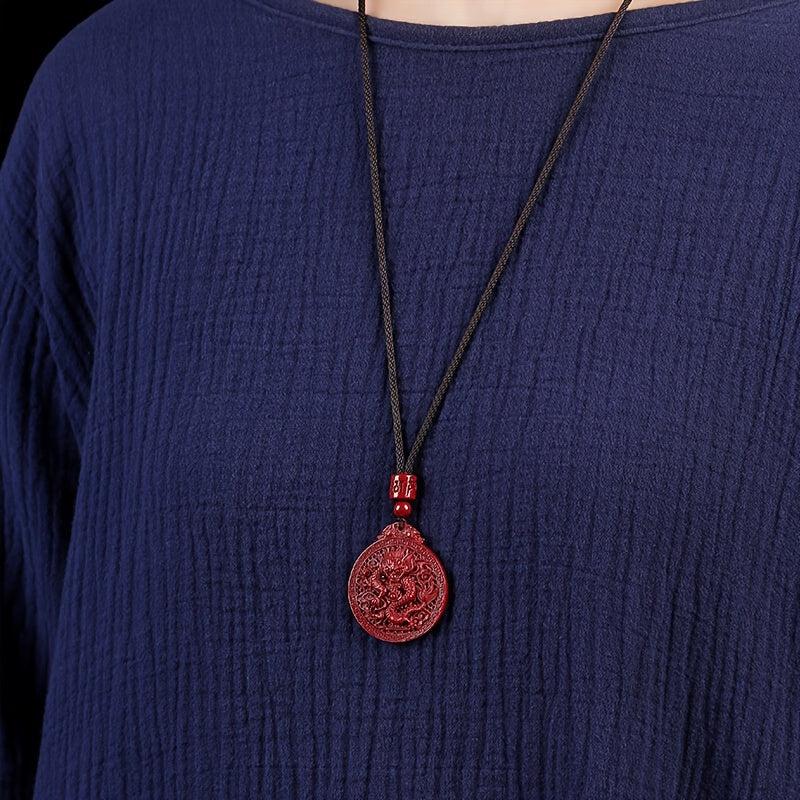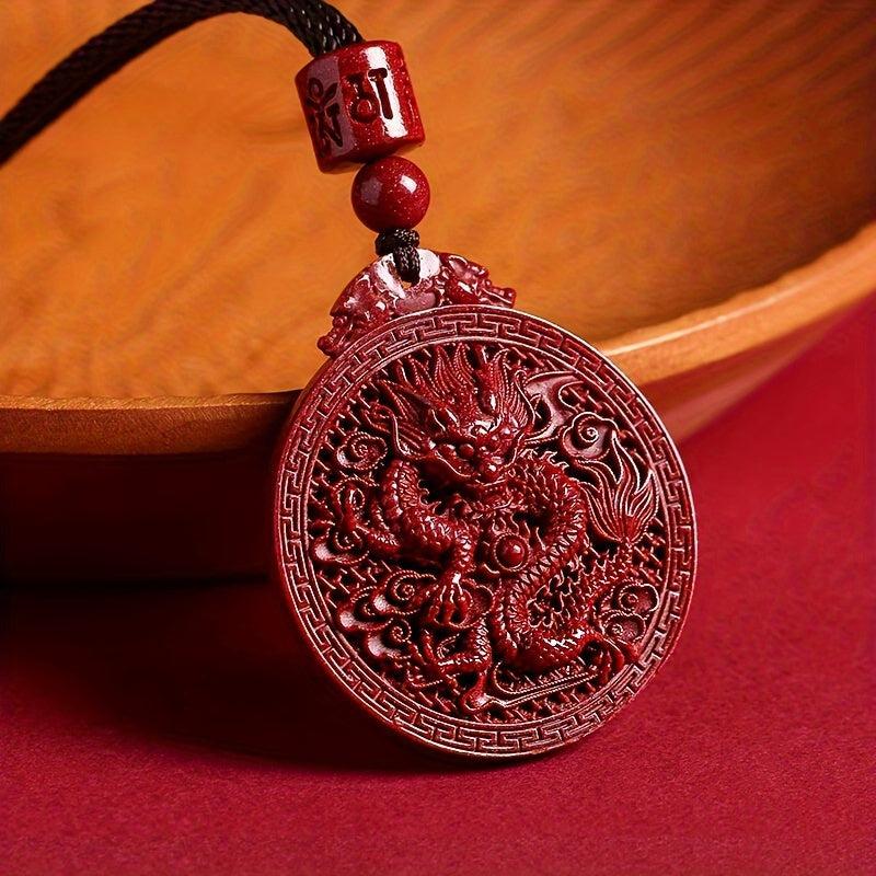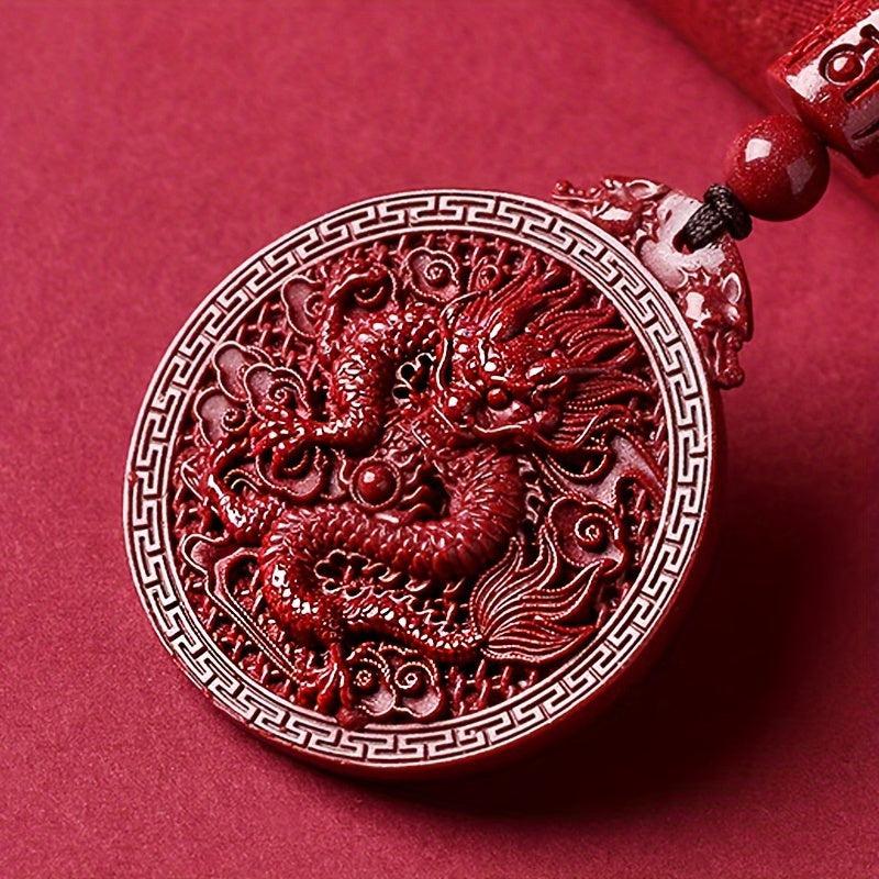 This Dragon Zodiac Cinnabar Stone Pendant is a symbol of luck and protection. It features a handsome design suitable for both men and women. Made without any plating or mosaic.