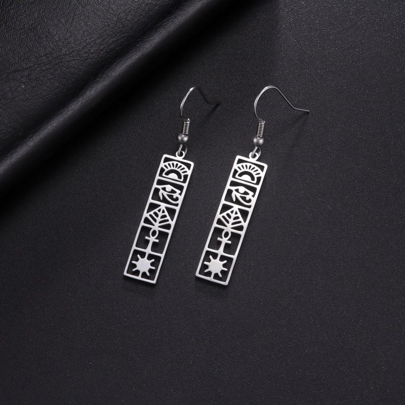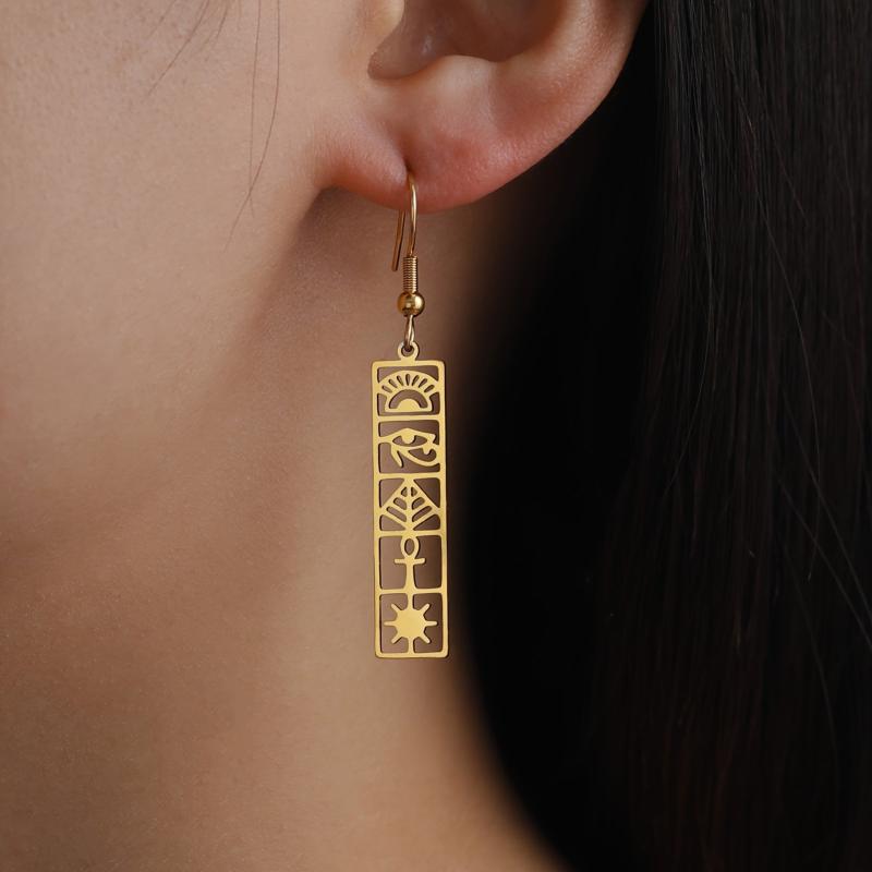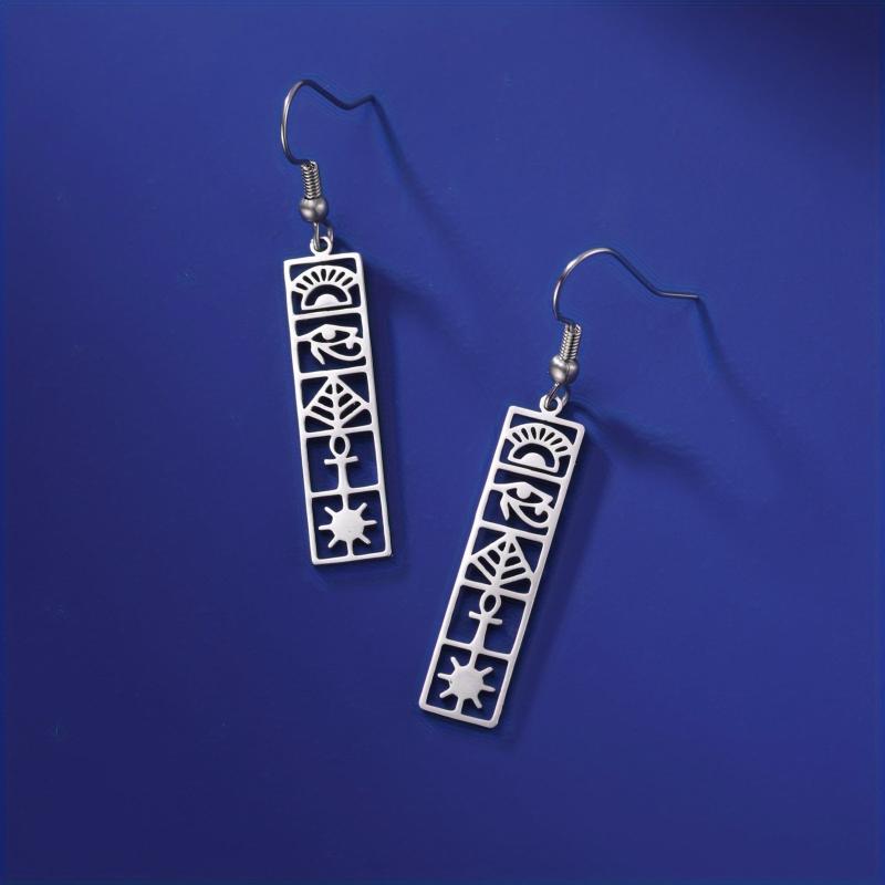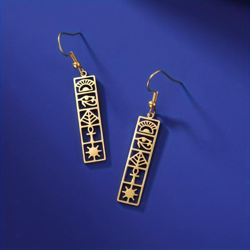 Enhance your style with these vintage Egyptian Horus eye earrings. Made with golden and silvery materials, these accessories add a touch of elegance to any outfit.
