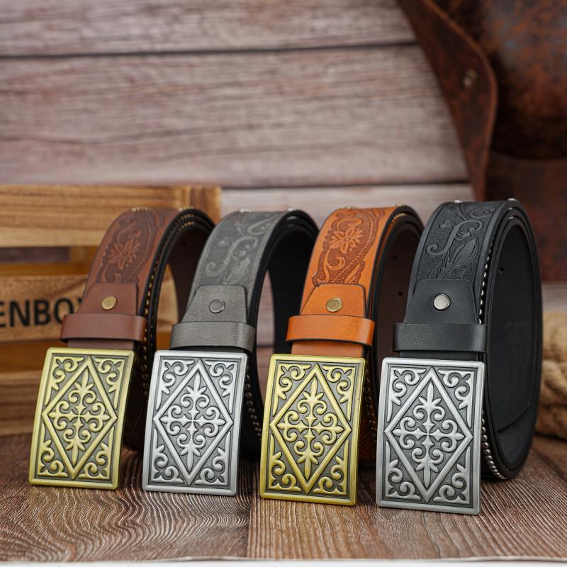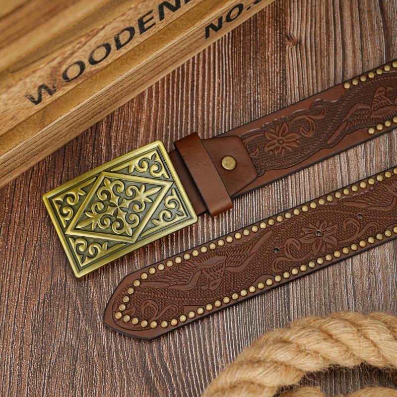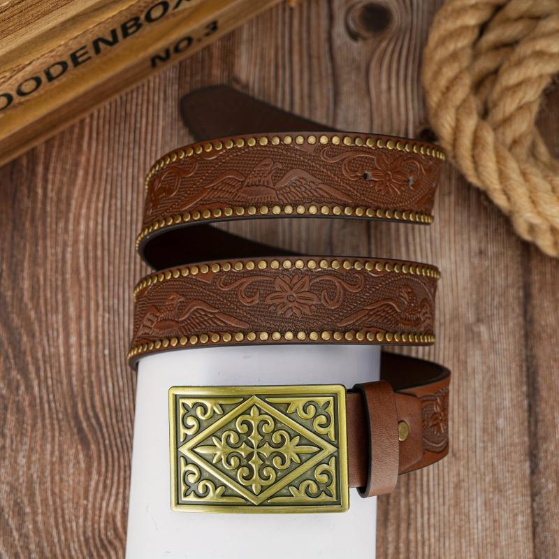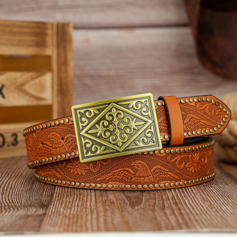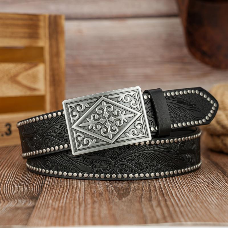 This men's belt features a distinctive square cross and eagle feather buckle design, made of faux leather with embossed rivets.