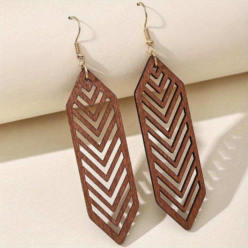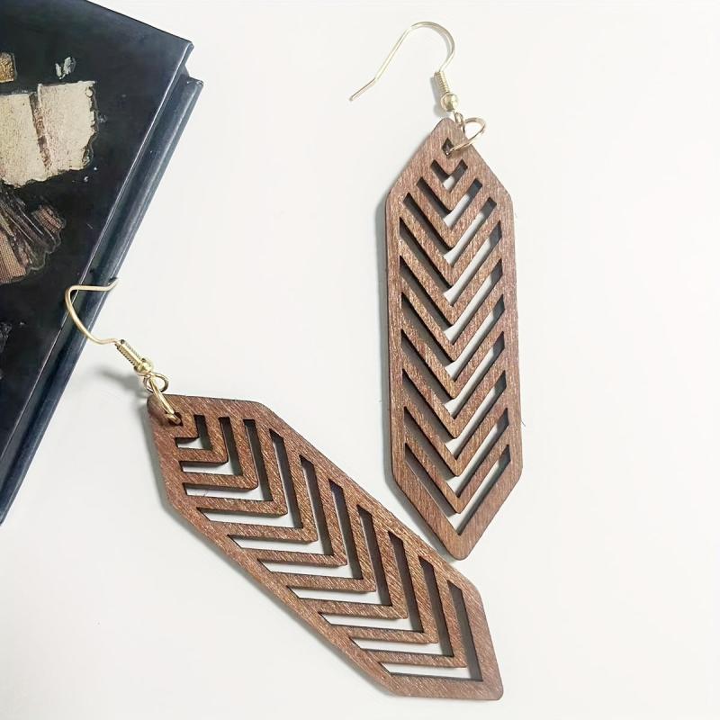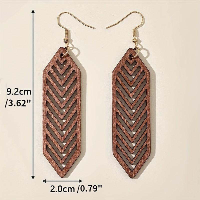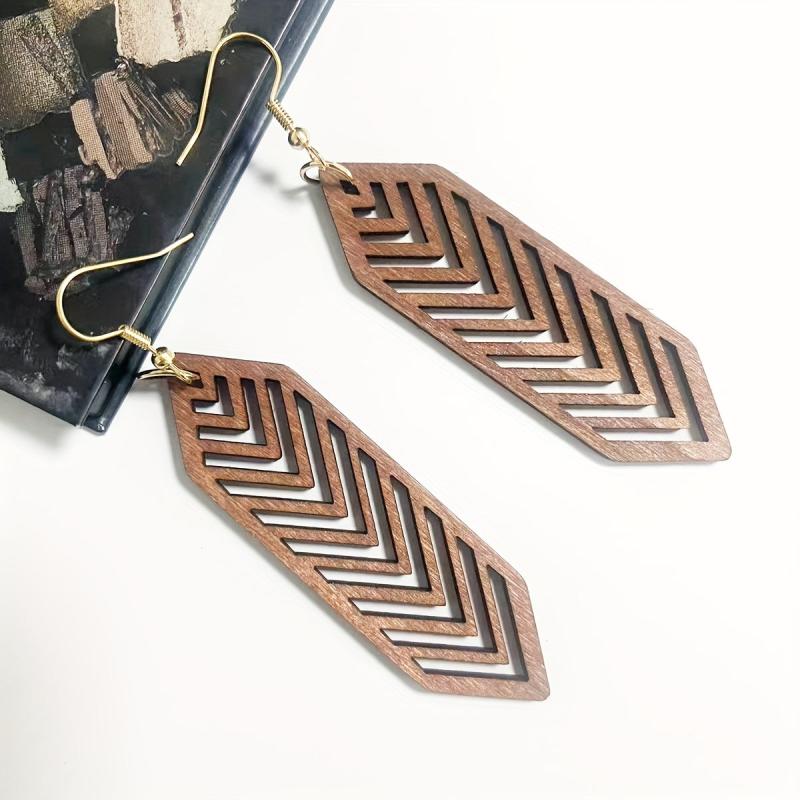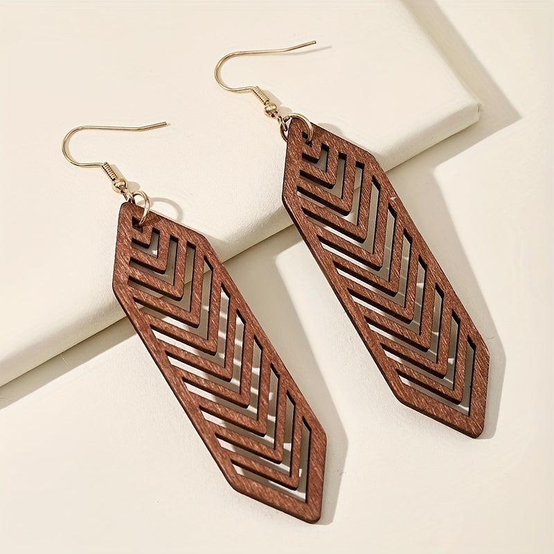 These dangle earrings feature a retro style hexagonal shape with hollow stripes pattern. Made of wood, these delicate earrings make a great gift for women.