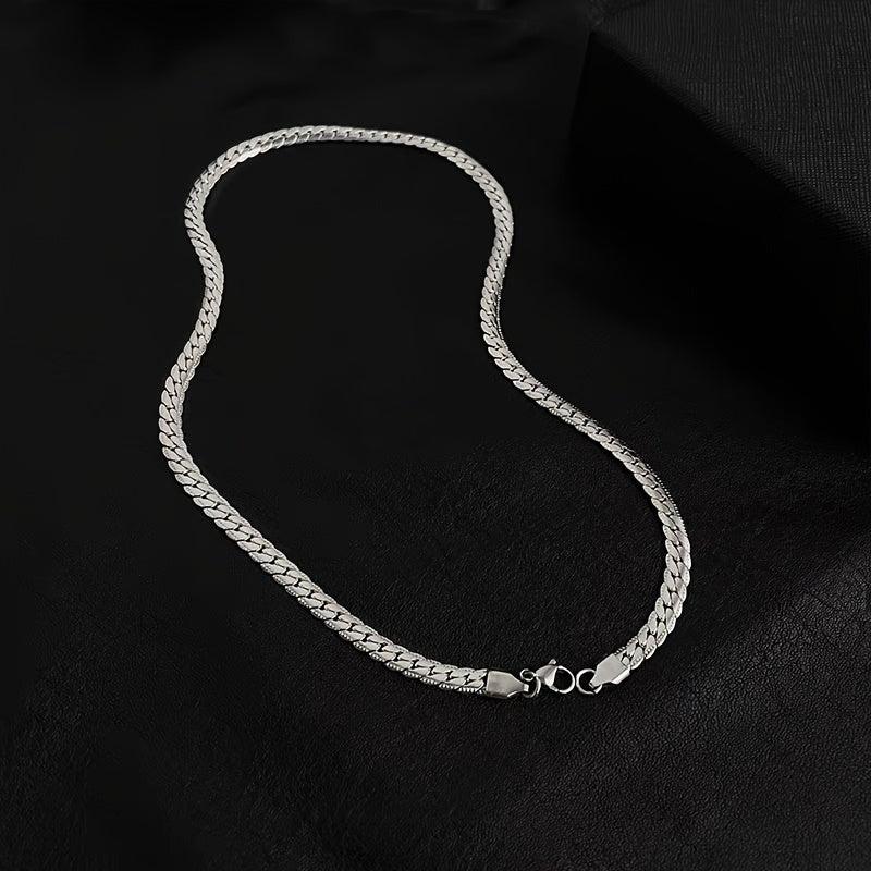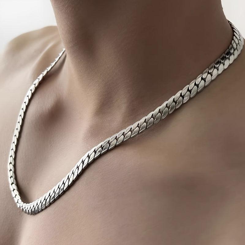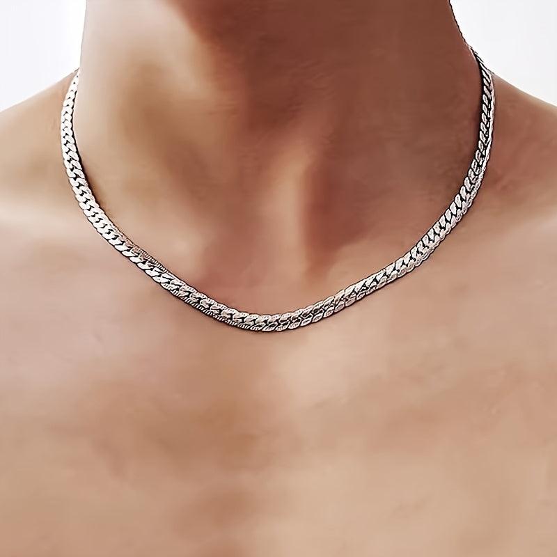 This embossed Cuban chain necklace for men is made of durable and non-fading silvery stainless steel. It is washable and ideal for gifting, parties, and vacations.
