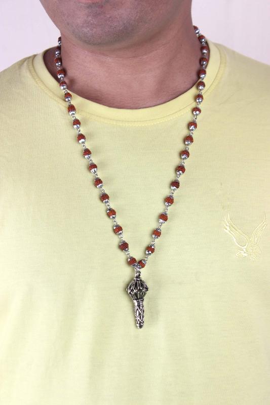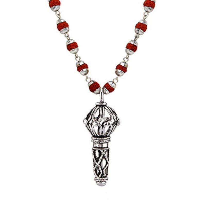 This religious pendant features Lord Hanuman's gada design and comes with a 24-inch Rudraksh mala for prayer and meditation.