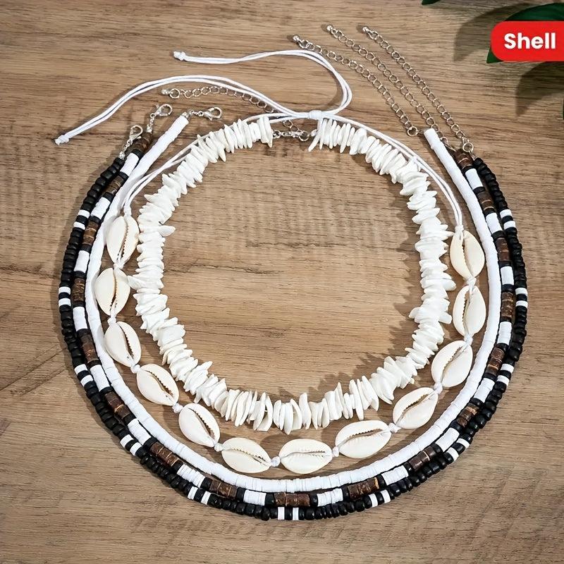 Enhance your casual attire with this versatile bohemian style shell bead necklace. Perfect for parties or year-round wear, this natural shell and cord necklace adds a touch of uniqueness to your look.