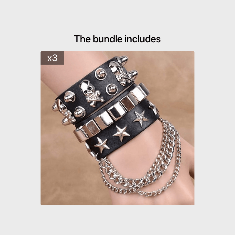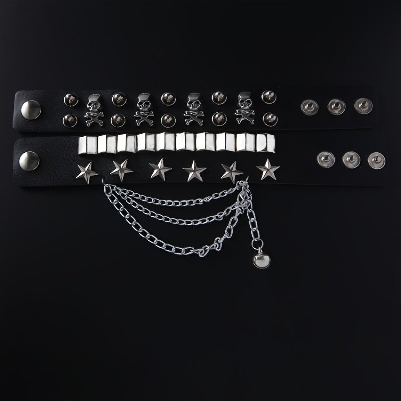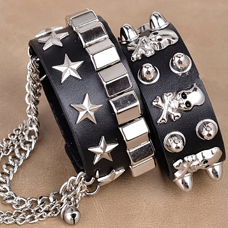 This bracelet features a layer of leather with a domineering skull design and rivets, perfect for adding a punk hip hop vibe to your look.