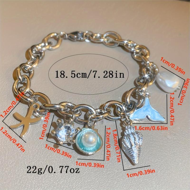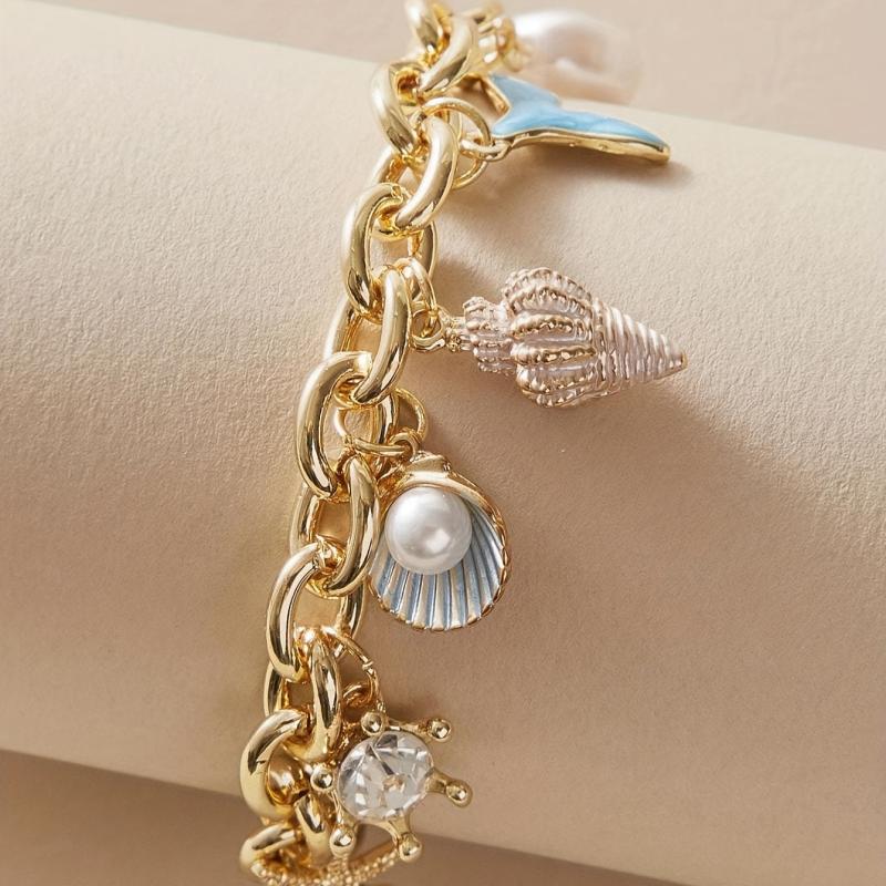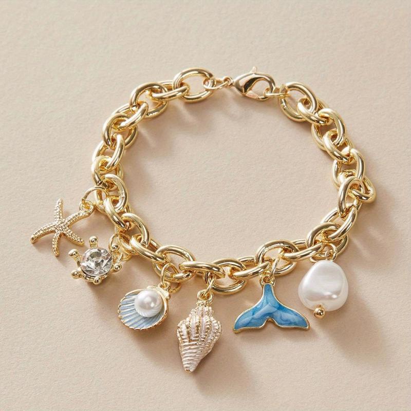 This elegant charm bracelet features a golden tone design with starfish, seashell, and whale tail charms. The bracelet is adorned with pearl and rhinestone accents, adding a touch of sophistication and charm.