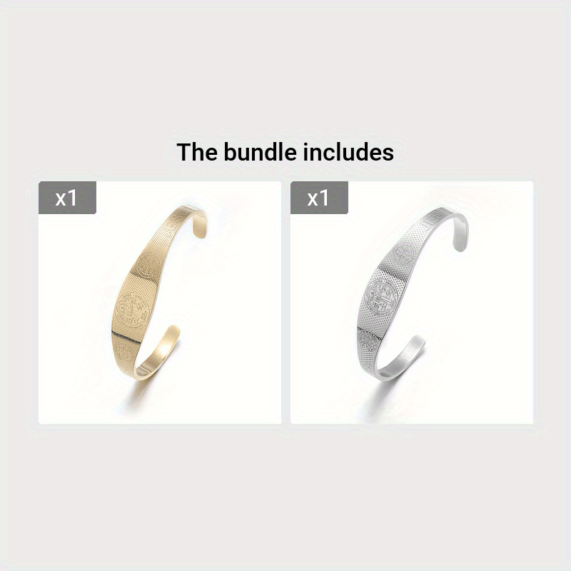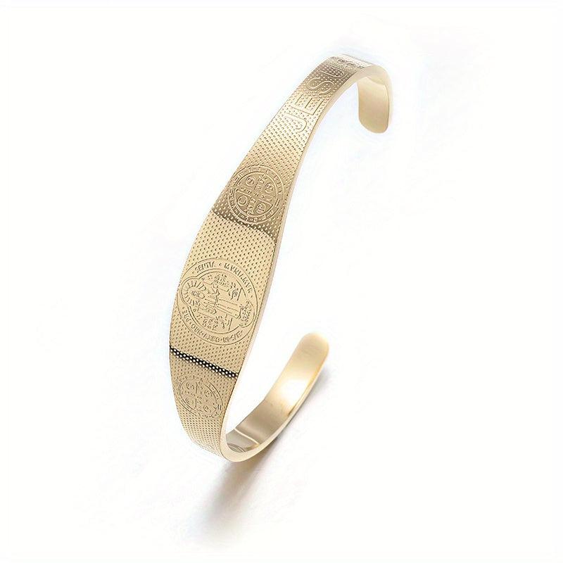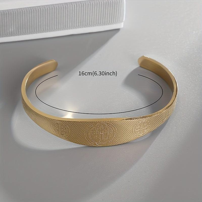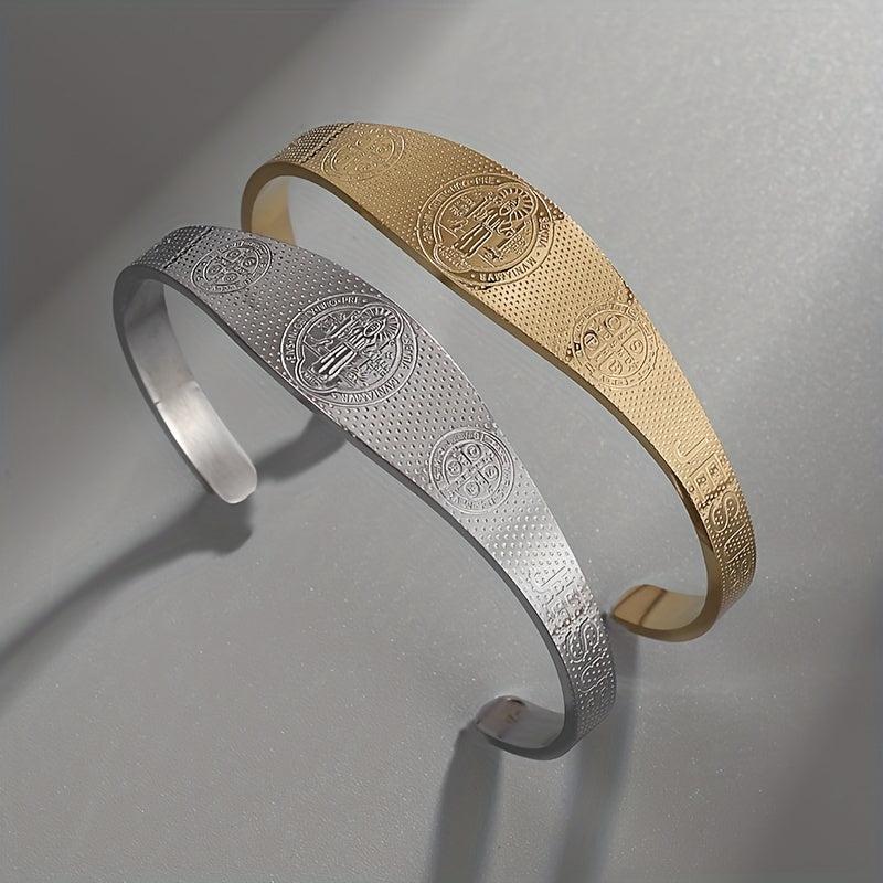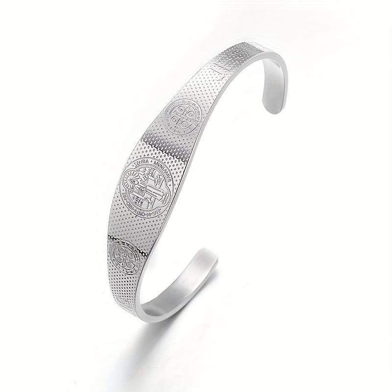 Elegant and stylish stainless steel cuff bracelet featuring Saint Benedict cross. Perfect for parties and holidays.