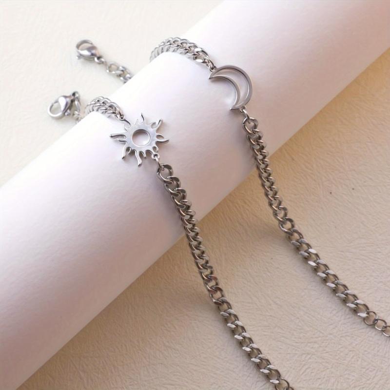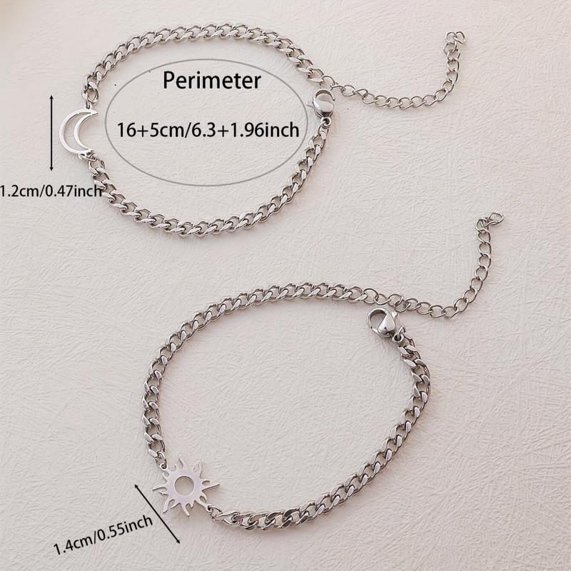 These stainless steel couple bracelets feature charming sun and moon designs with flower and star accents. Perfect for daily wear or parties.