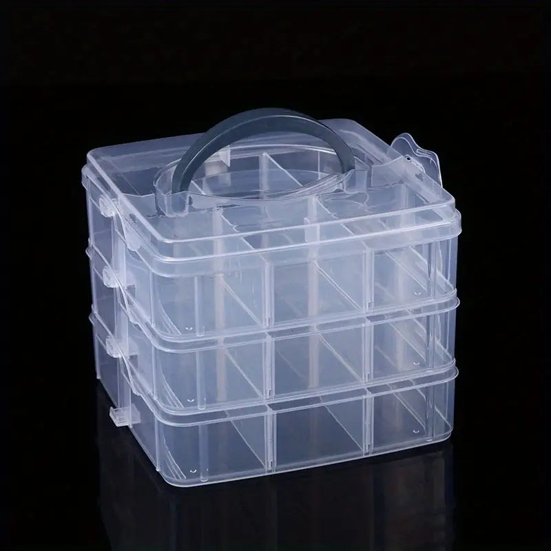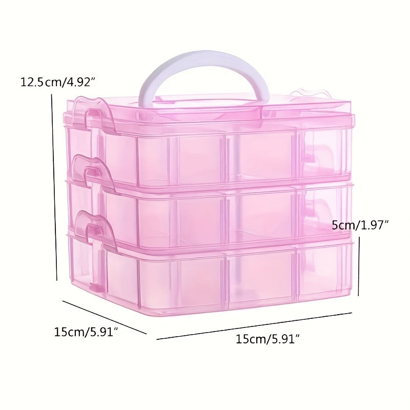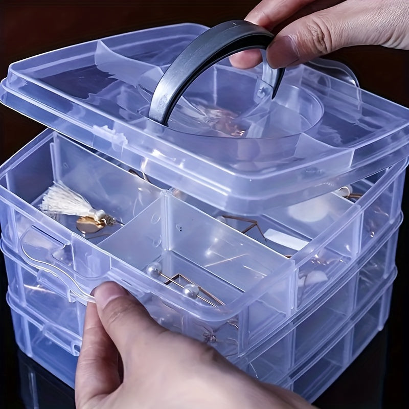 Keep your jewelry, accessories, and toys organized with this transparent plastic storage box. It has three layers for efficient storage and easy access.