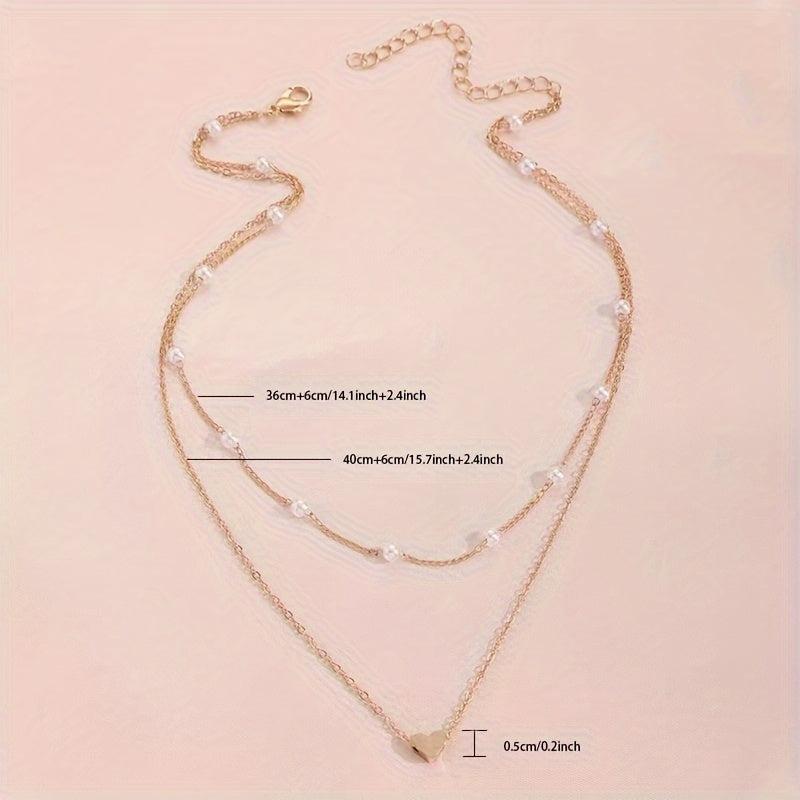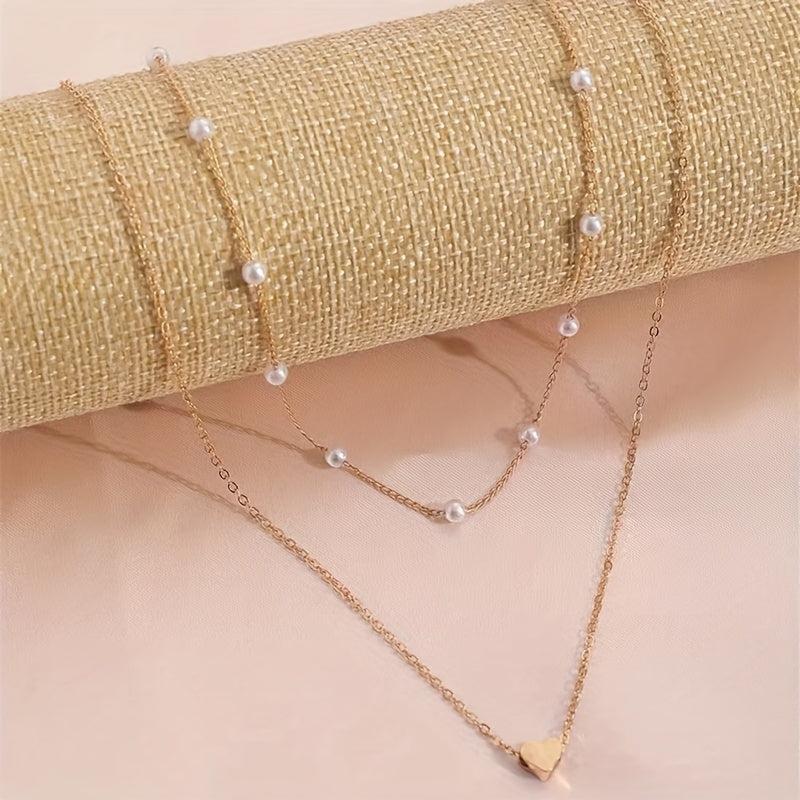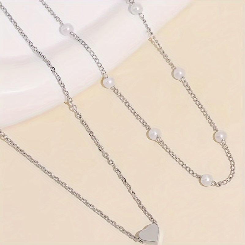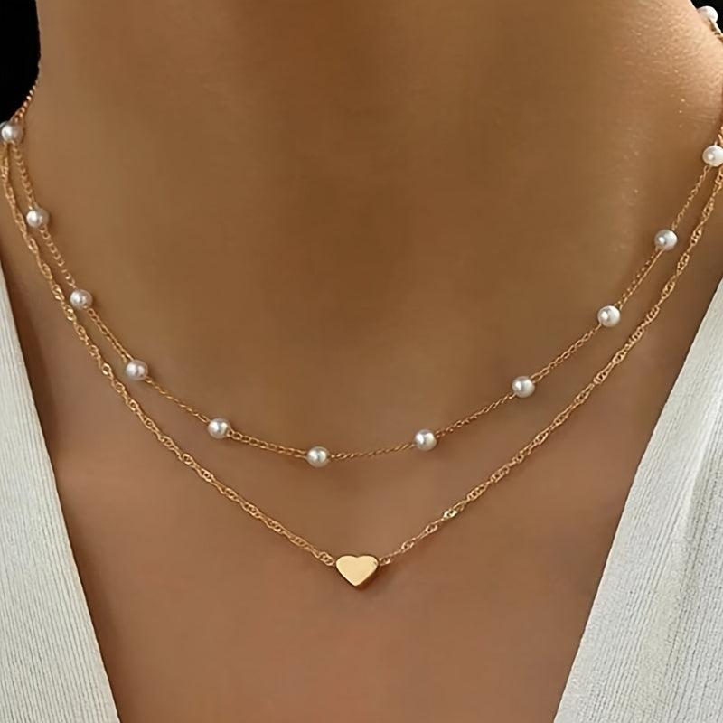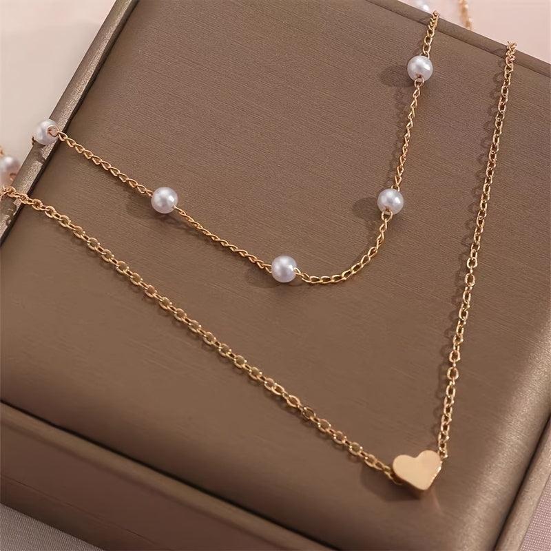 This double layered necklace features a vintage boho style with pearls and heart pendant. It's a versatile piece suitable for daily wear and gifting throughout all seasons.