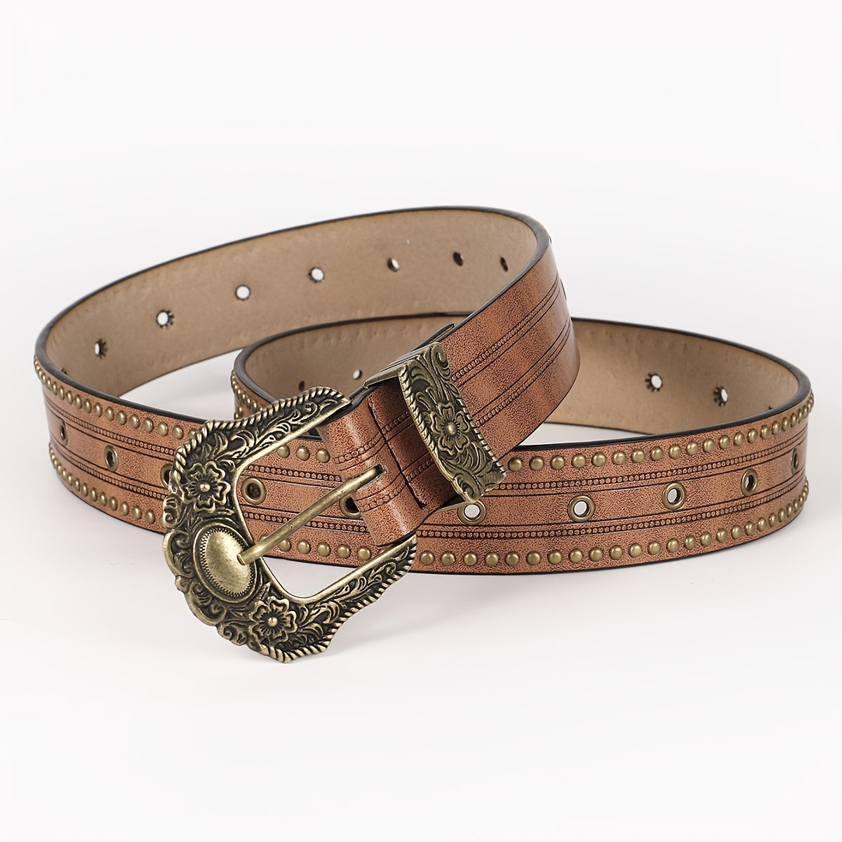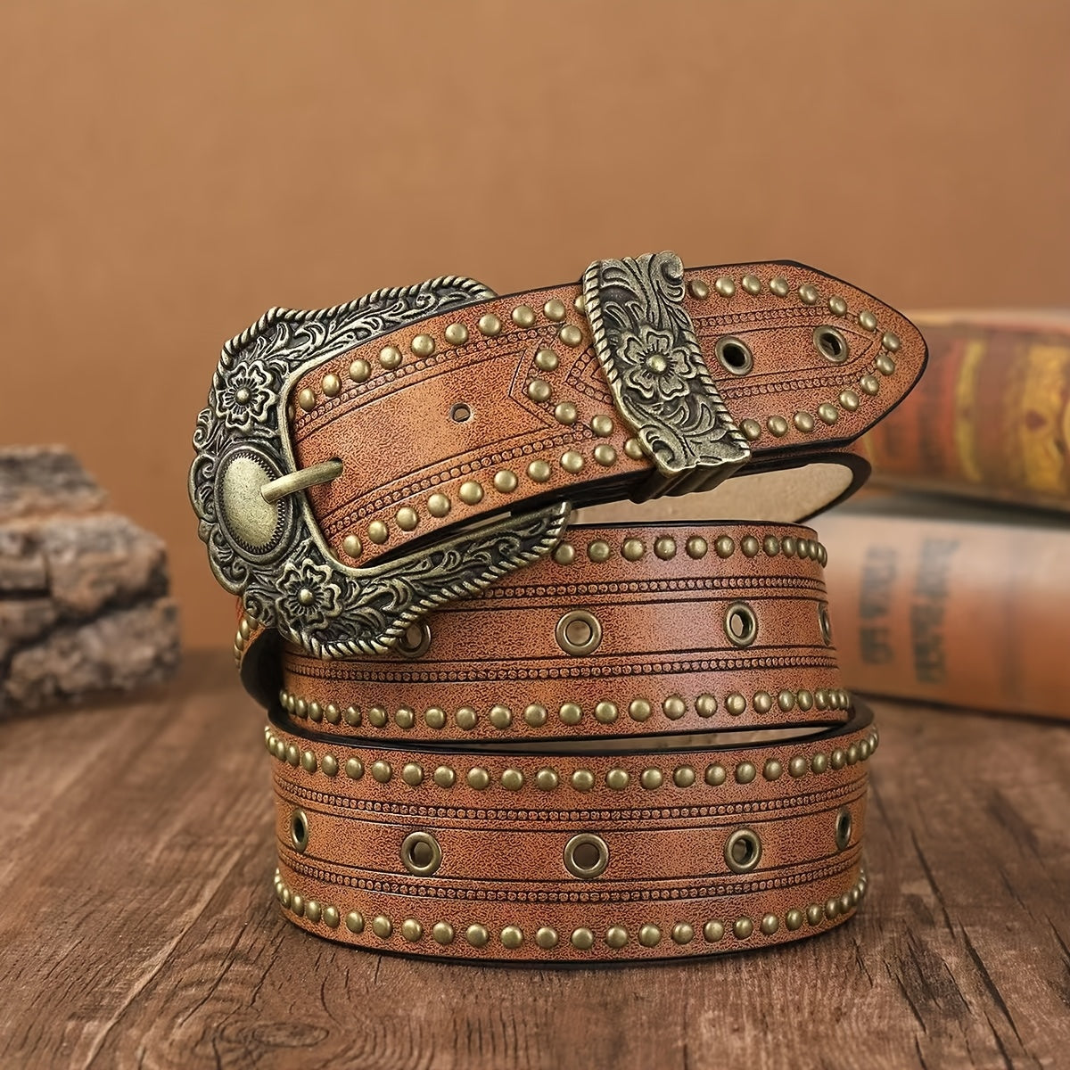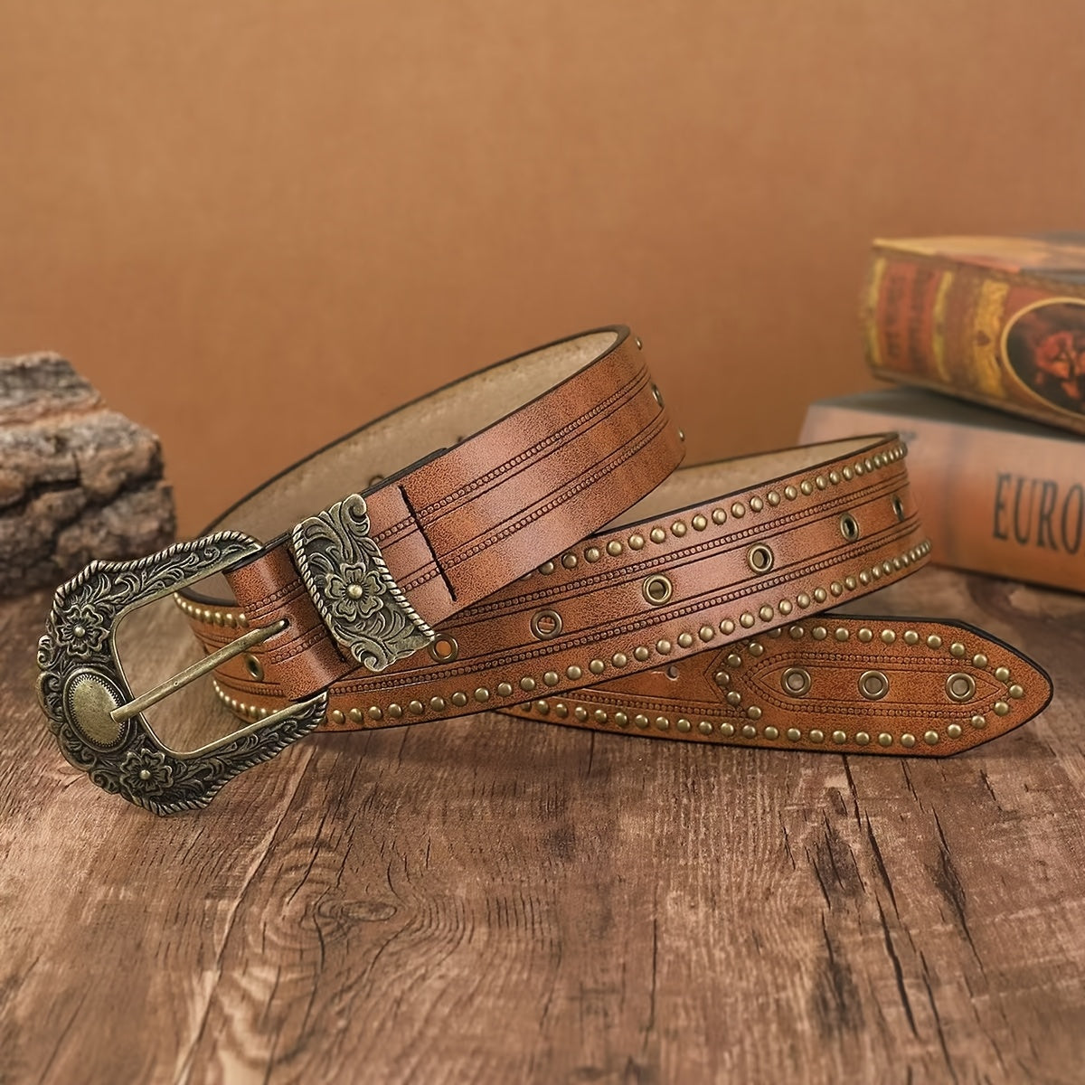 Add a touch of punk style to your outfit with this rivet embellished belt. Made of faux leather with a non-textile weave, this belt is perfect for daily commute, sports events, parties, and casual weekend outings. It does not contain any feathers.