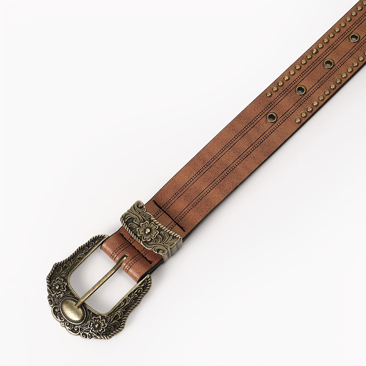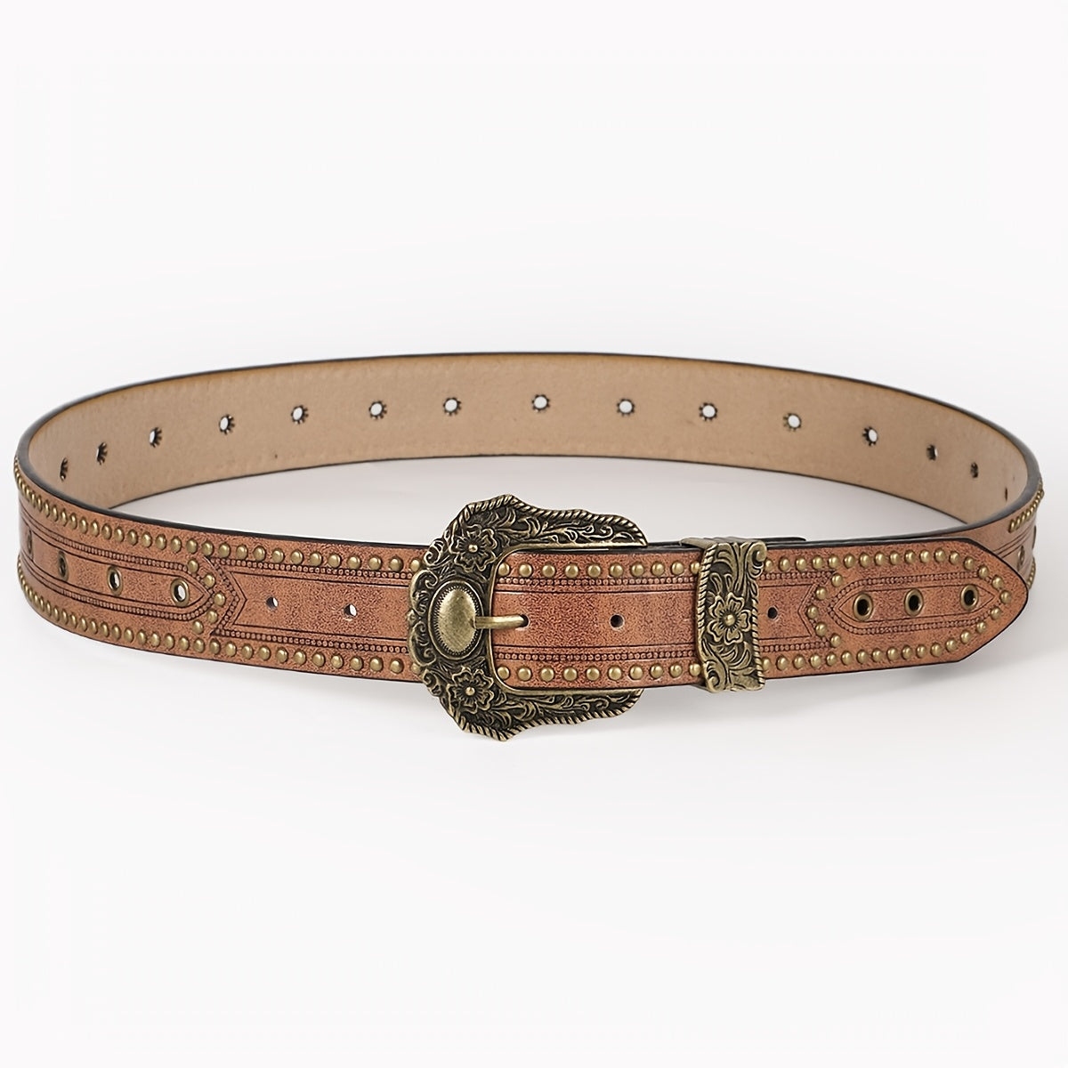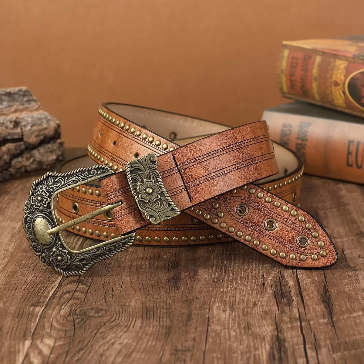 Add a touch of punk style to your outfit with this rivet embellished belt. Made of faux leather with a non-textile weave, this belt is perfect for daily commute, sports events, parties, and casual weekend outings. It does not contain any feathers.