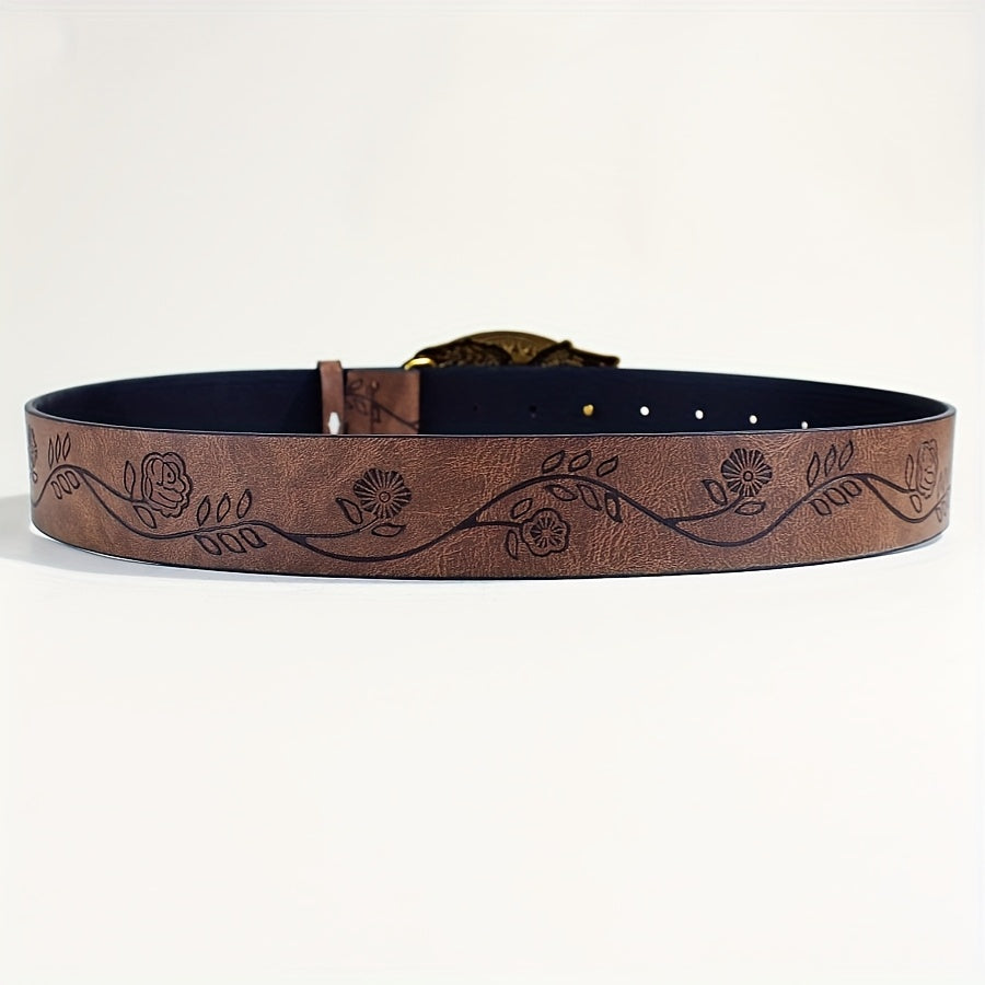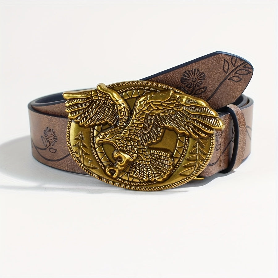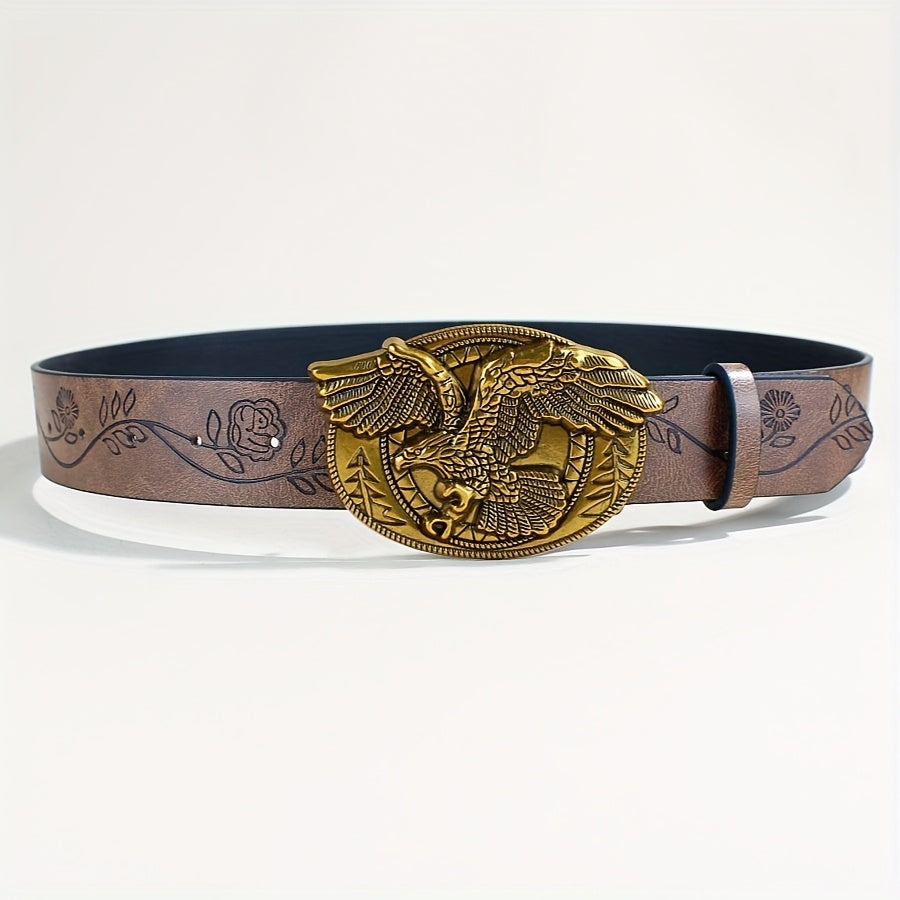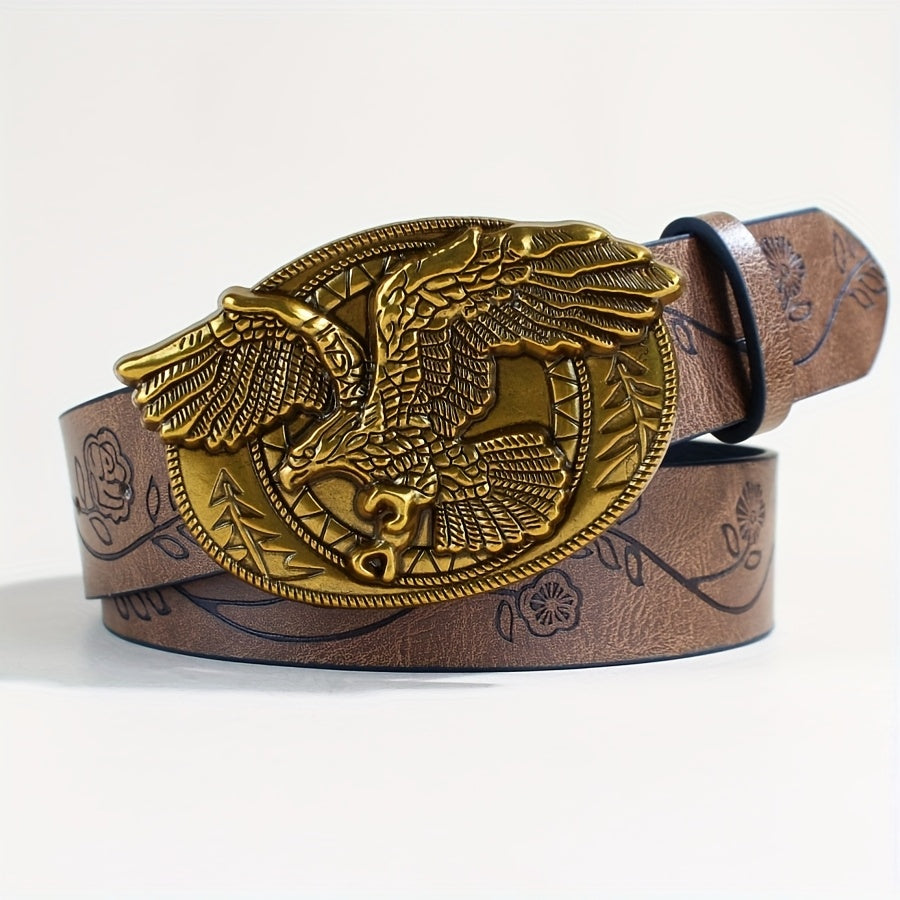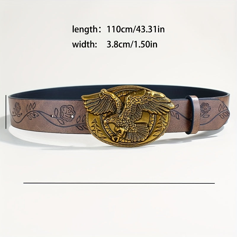 Classic Unisex belt with a vintage Western design featuring an embossed golden tone eagle buckle.