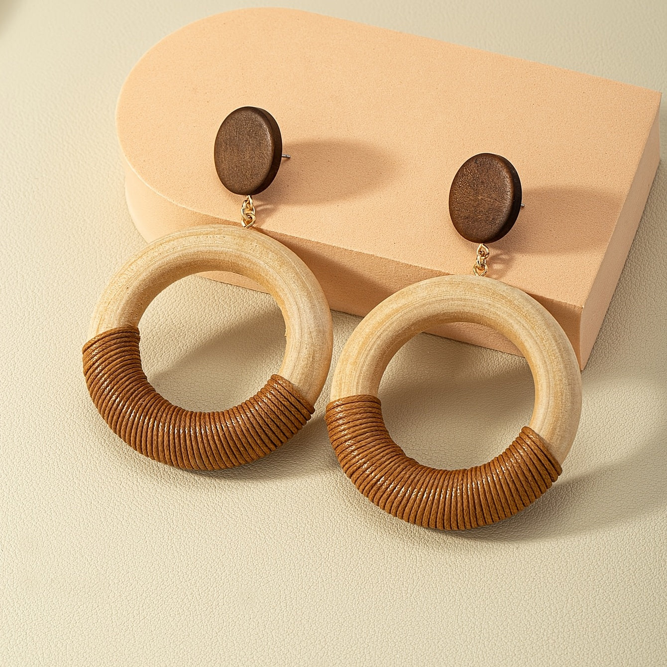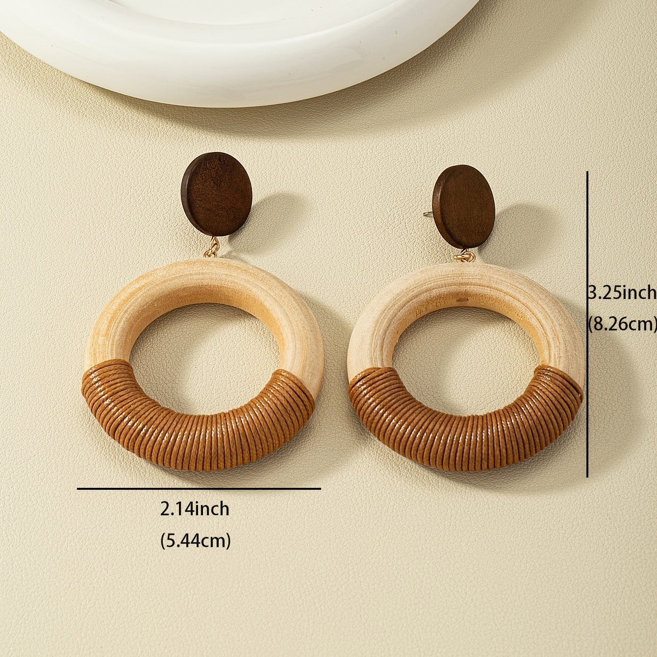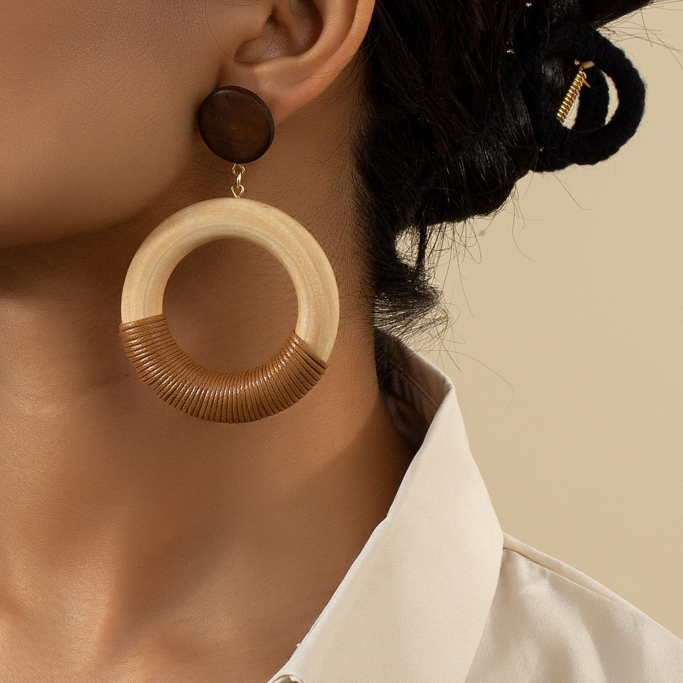 Add a touch of vintage charm to your outfit with these lightweight wood hoop earrings. The exaggerated drop design and geometric patterns create a boho chic look.