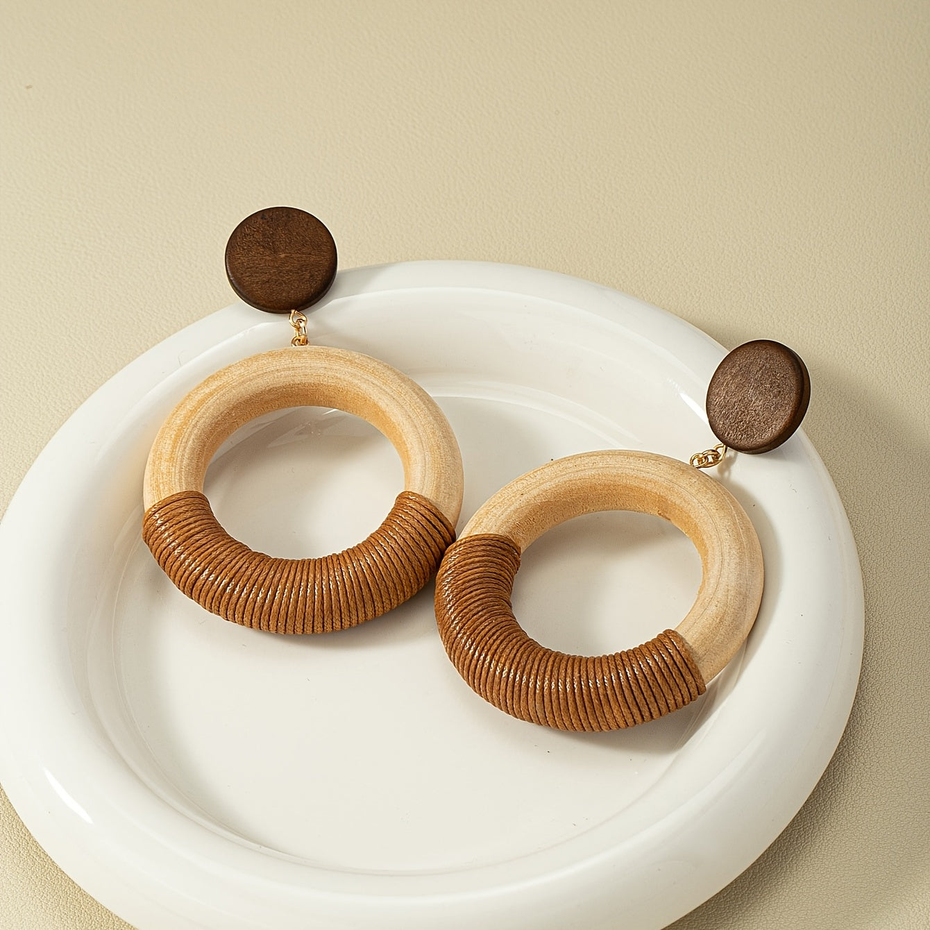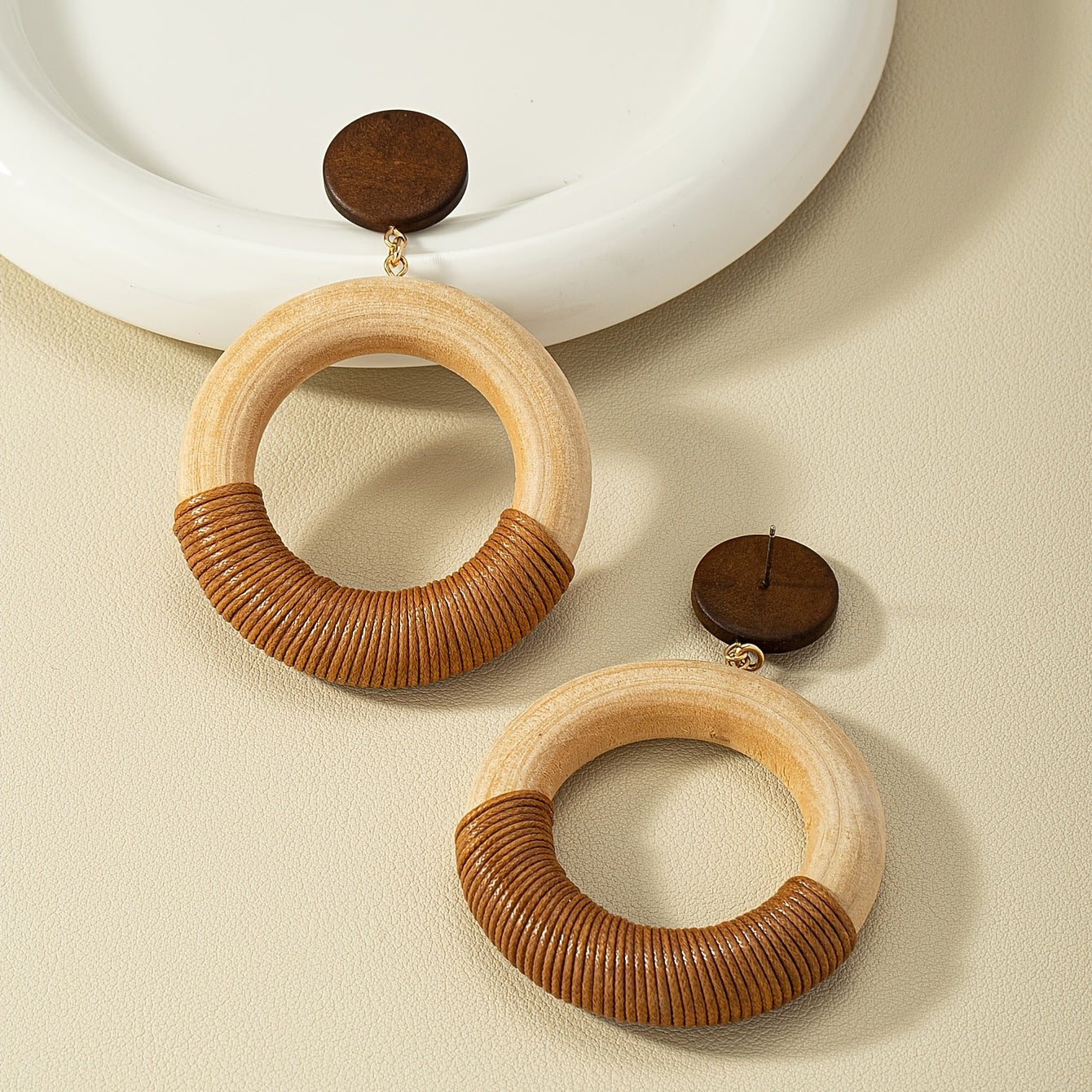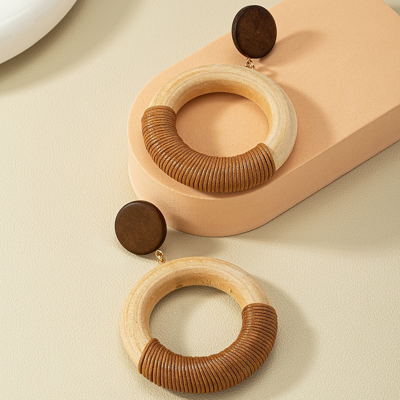 Add a touch of vintage charm to your outfit with these lightweight wood hoop earrings. The exaggerated drop design and geometric patterns create a boho chic look.
