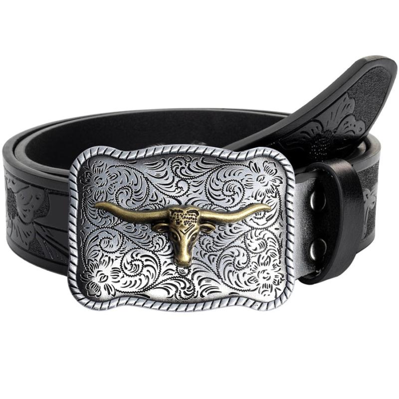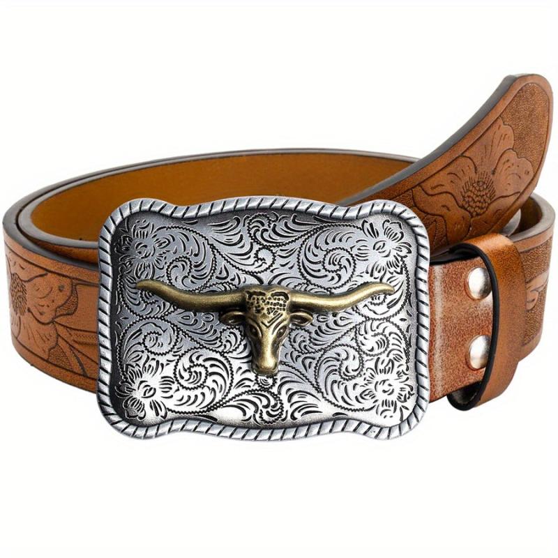 Complete your cowboy look with this stylish Western belt featuring a bull head buckle and embossed floral design. Made from high-quality brown faux leather, perfect for pairing with jeans or casual wear.
