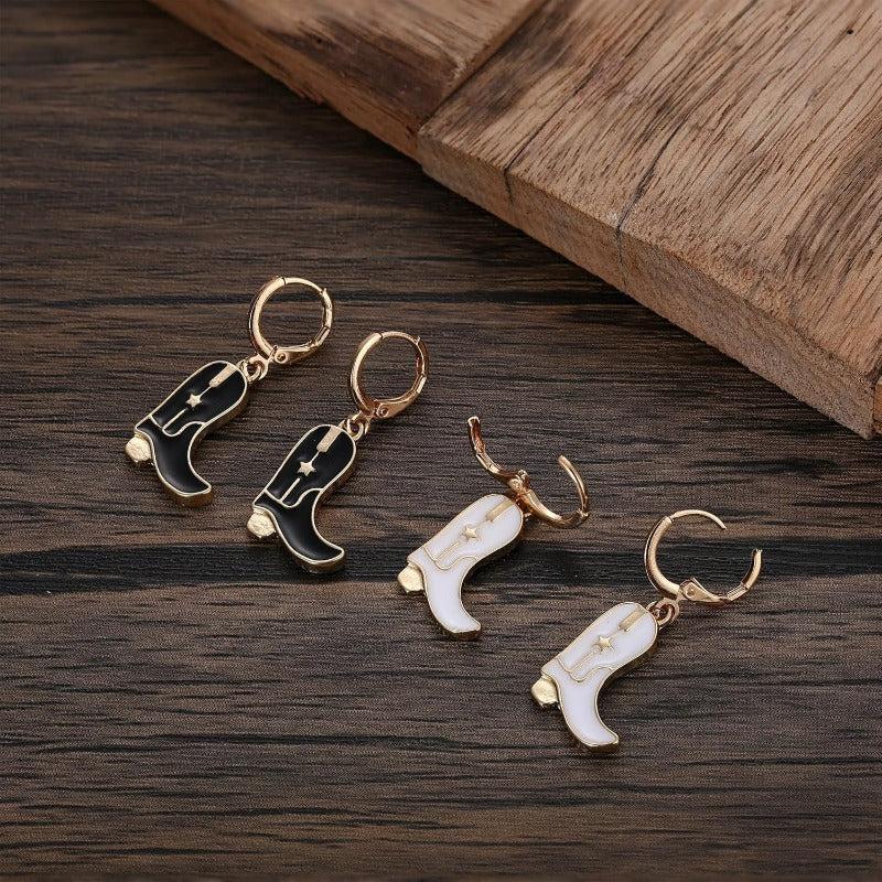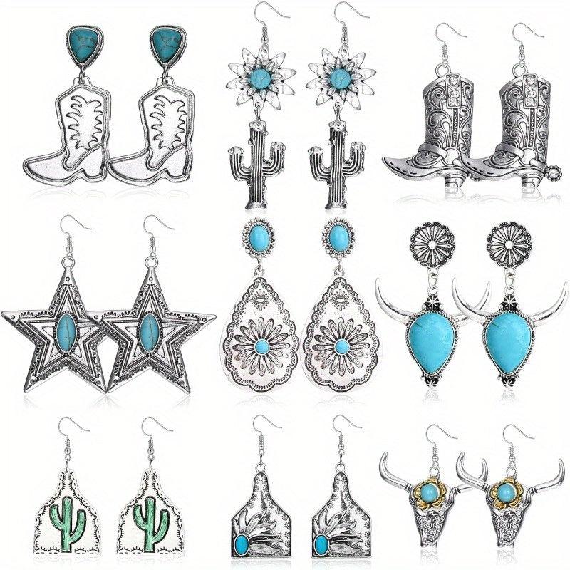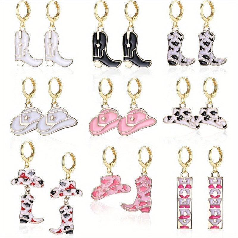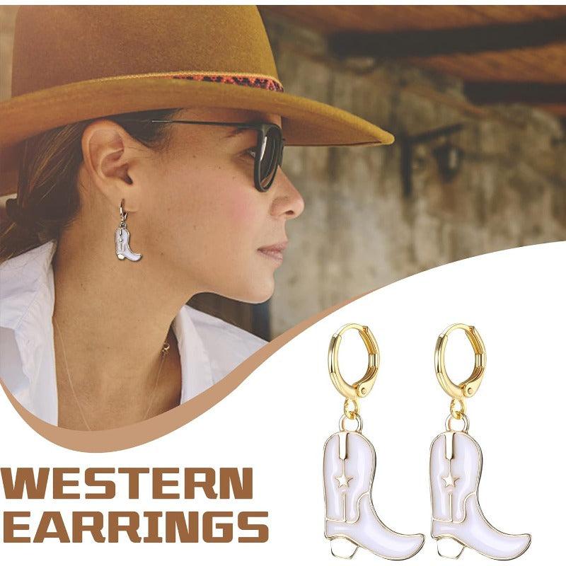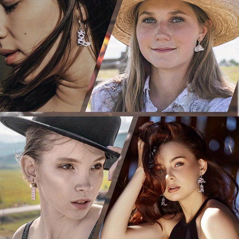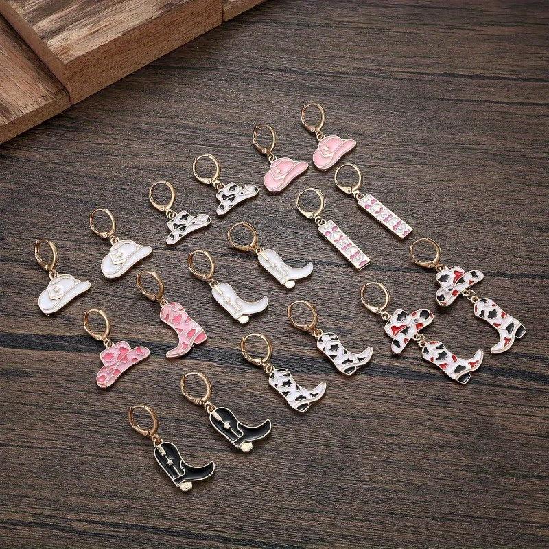 Complete your cowgirl look with this charming set of western-themed earrings. Featuring cowboy boot, bull, and hat designs, these dangle earrings add a touch of rustic flair to your outfit.